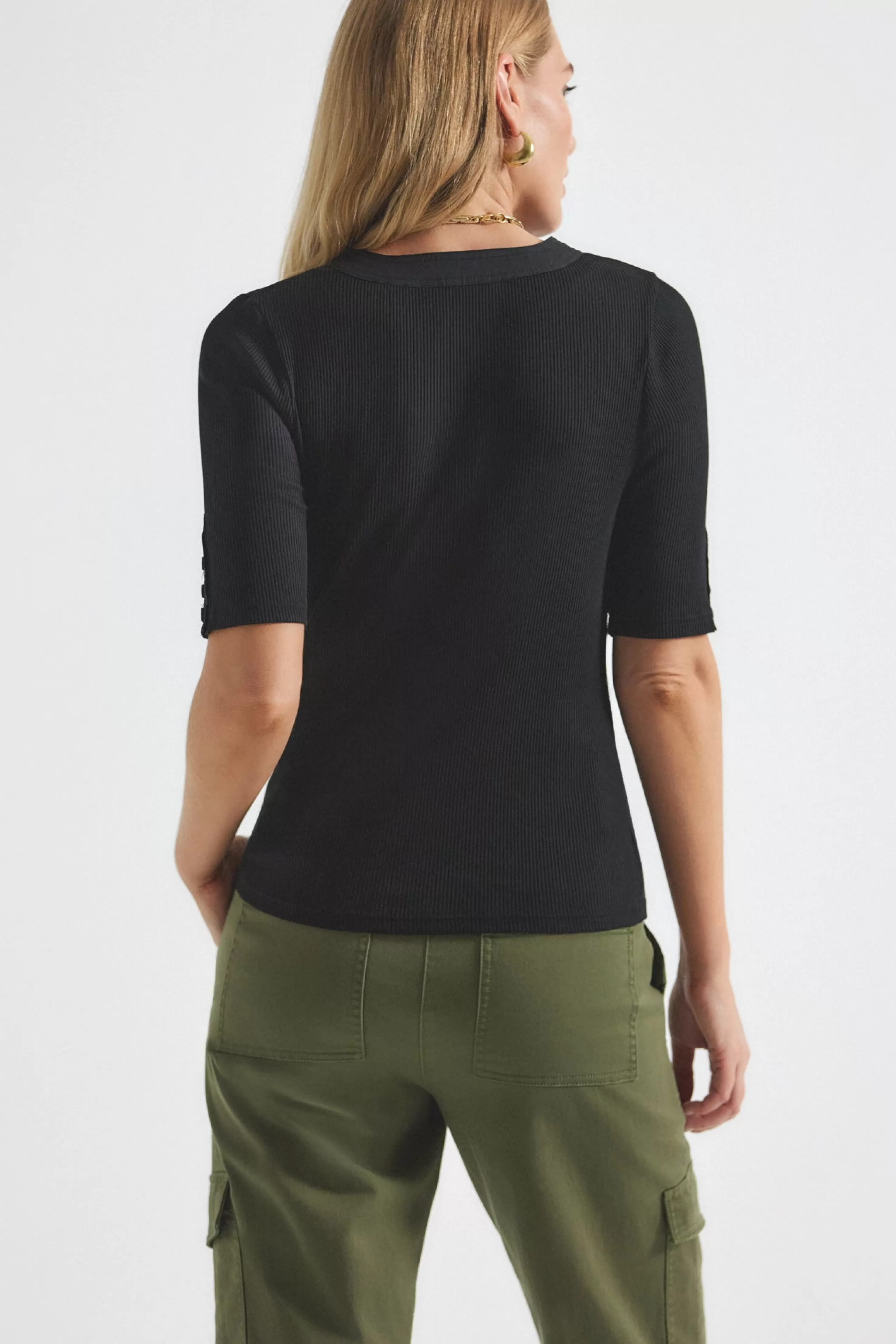 The Adrian Tee is a soft cotton poplin style with soft ribbing throughout. It features a button collar detail and three quarter sleeves.