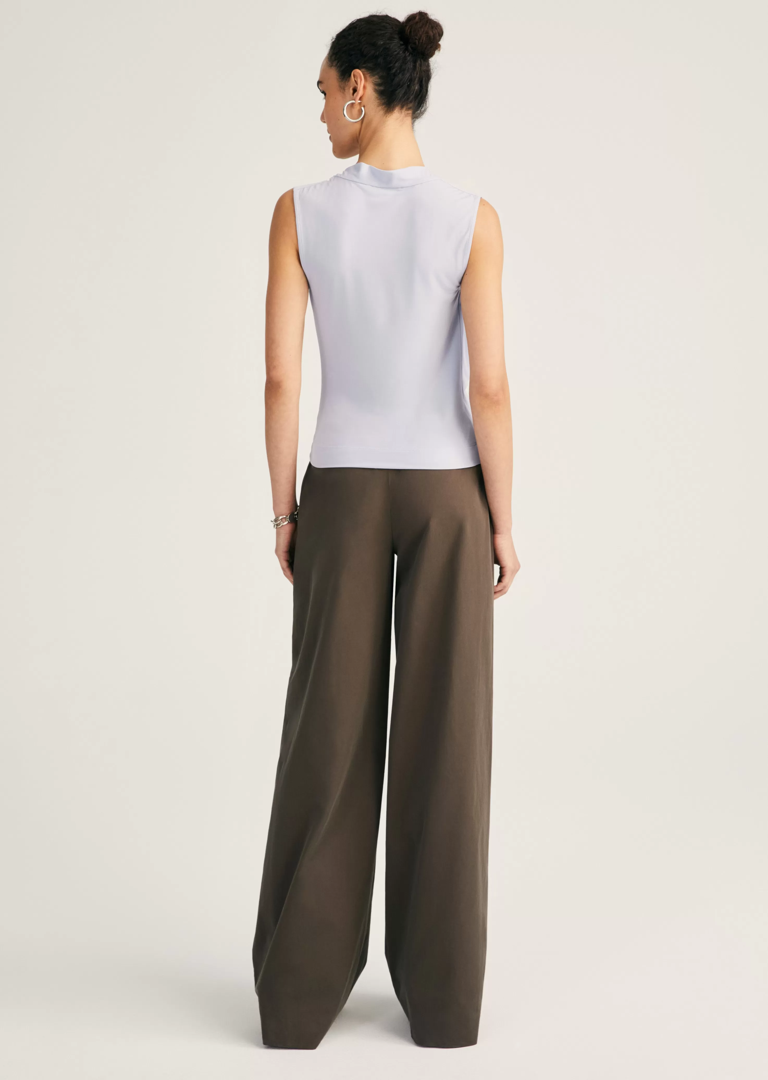 The Alya Sleeveless Draped Top is a fluid draped style crafted from ultra soft crepe jersey. It features a seamless design with a loop twist detail on one side.