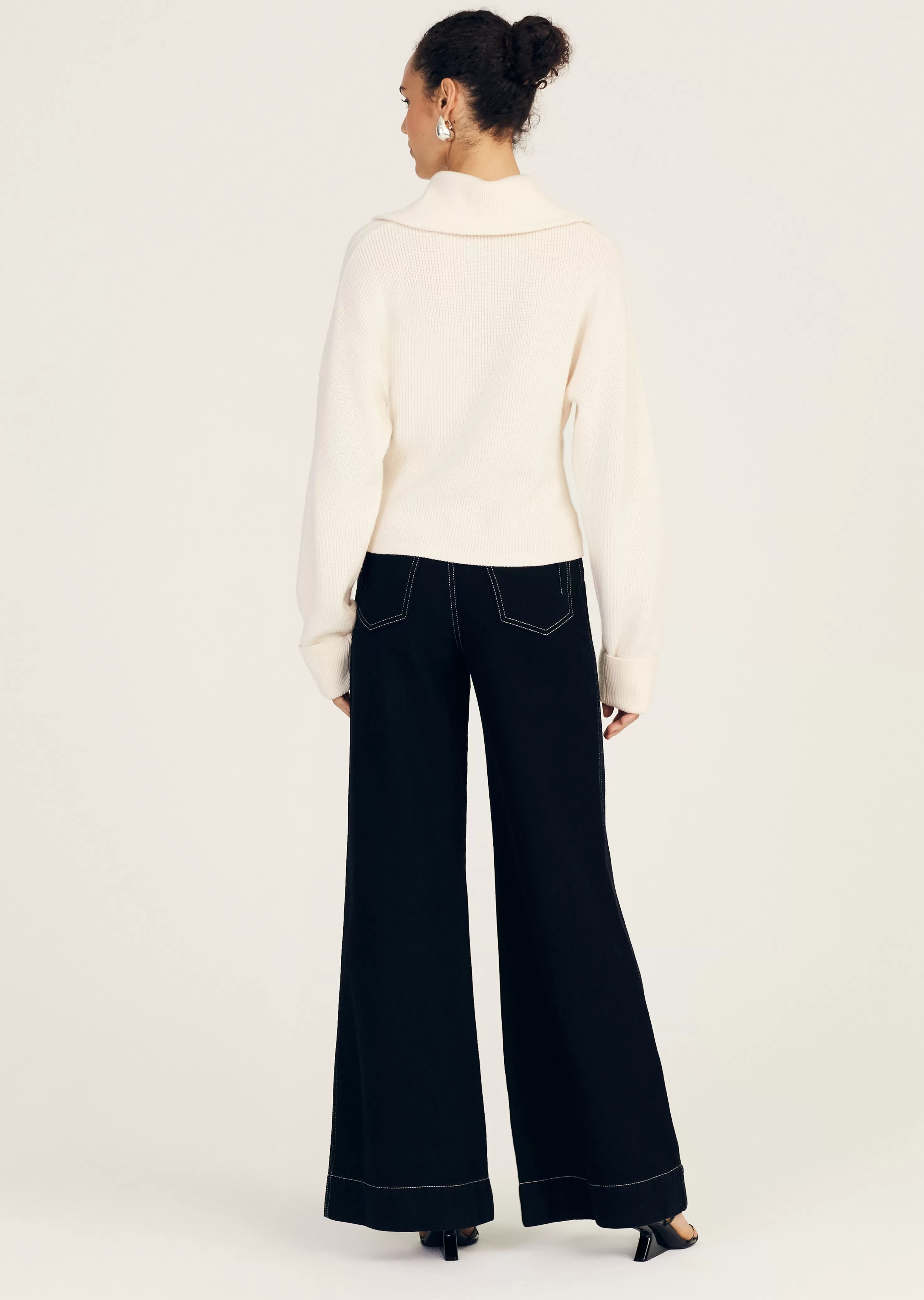 The Armanda Zip Front Sweater is a softly structured, cable knit style crafted from 100% merino wool. It features an extended collar, cuffed sleeves, and an exposed two-way zipper.