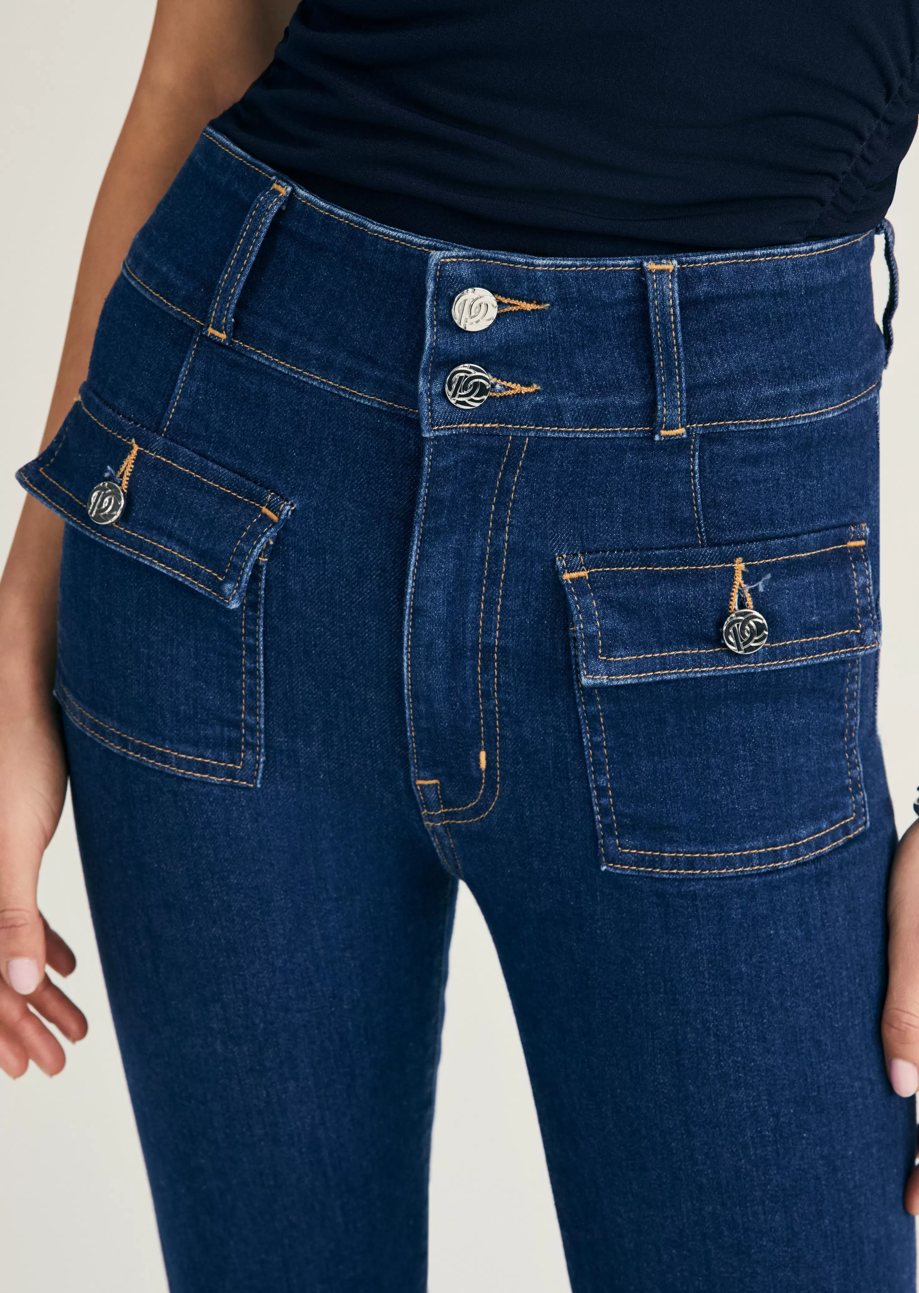 The Barlow Pocket Front Flare is a new utility style with topstitched detailing and an extended waistband. They feature buttoned patch pockets with novelty logo buttons and a classic dark blue wash.