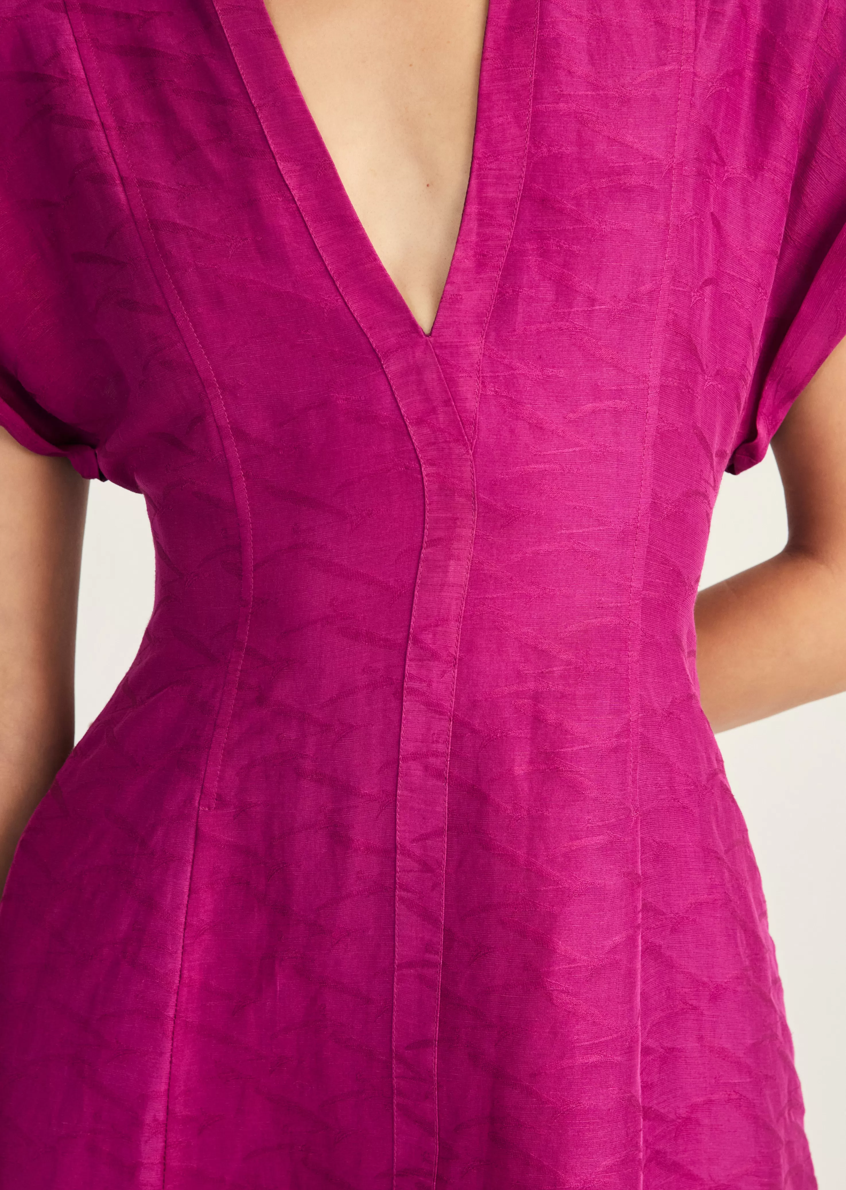 The Christina Short Sleeve Mini Dress is a fit and flare style crafted from a soft silk and linen blend. It features a subtle, textural pattern with princess seaming throughout, an extended cuffed shoulder, and on seam pockets.