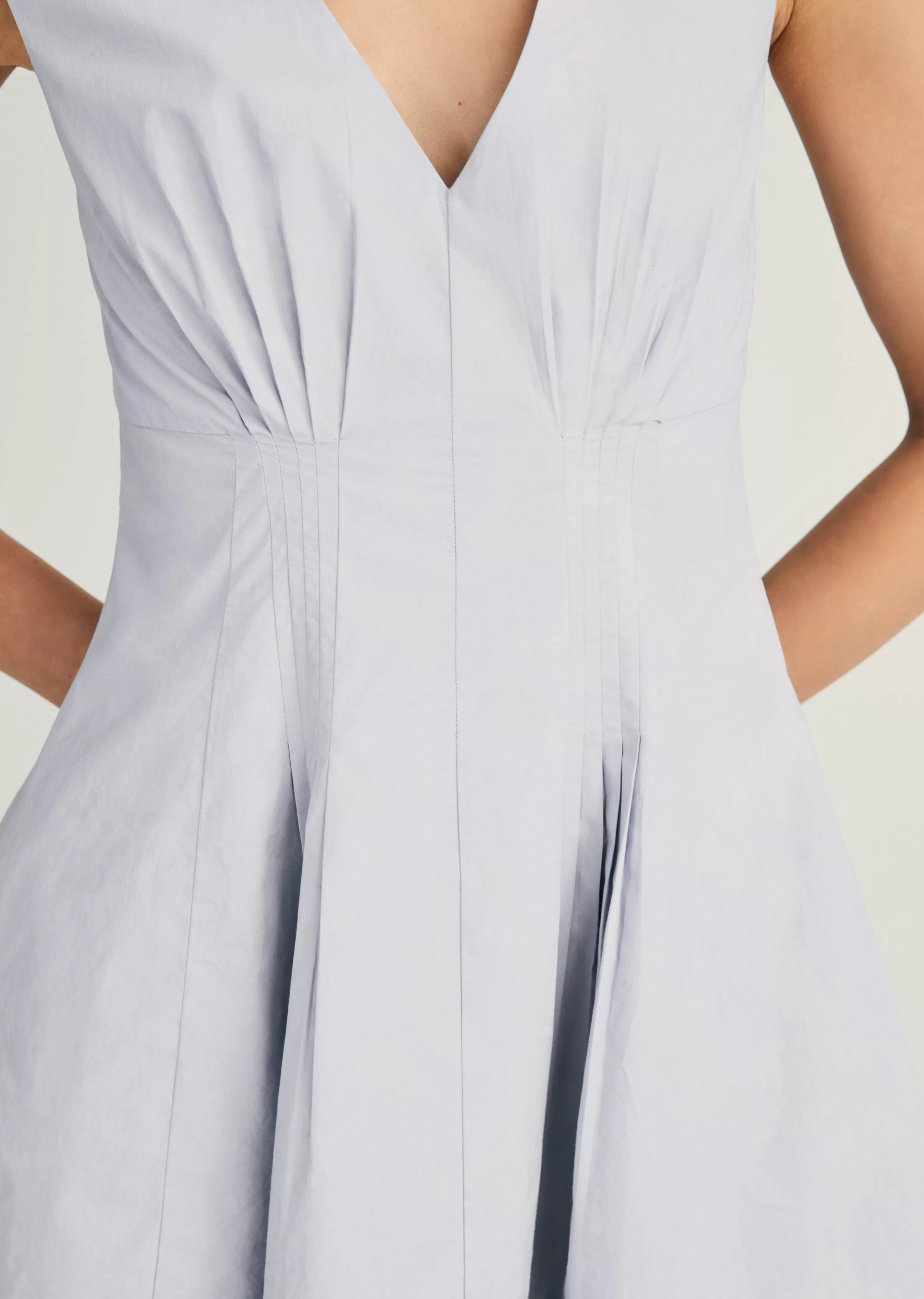The Concha Sleeveless V-neck Dress is an airy summer style crafted from 100% cotton poplin. It features a smooth waist accentuated by pleating on the bodice and skirt. Finished with a small back panel and fully lined interior.