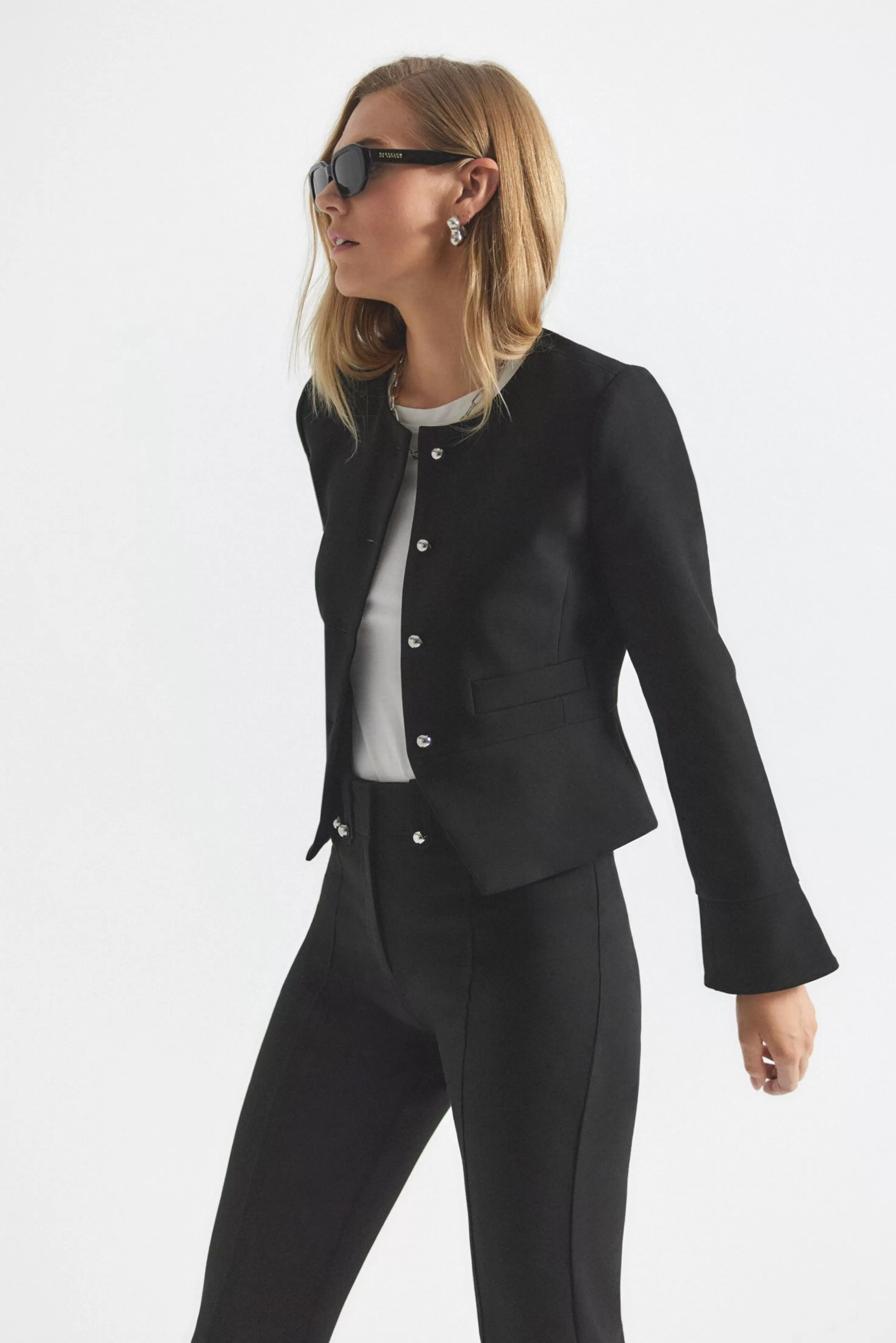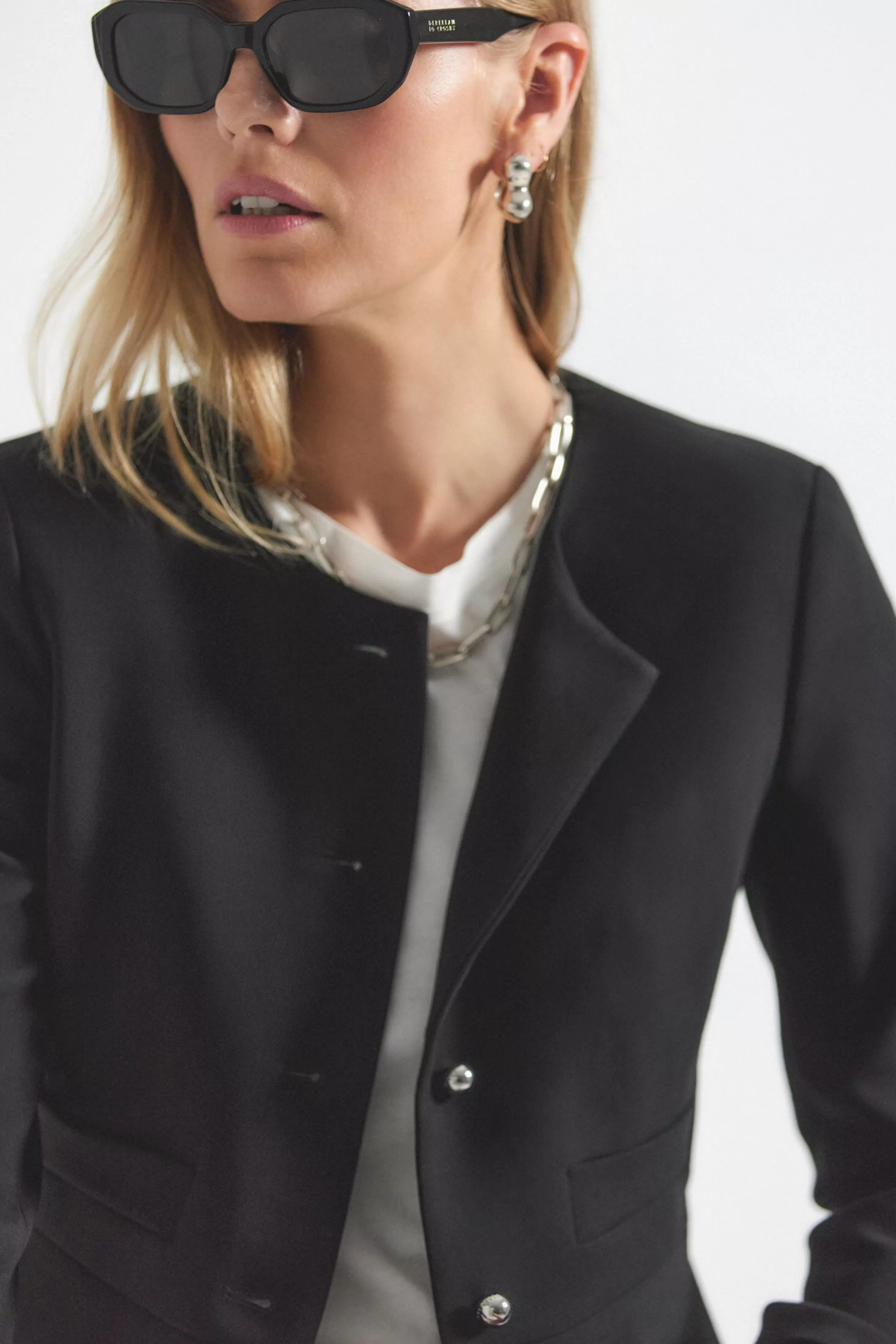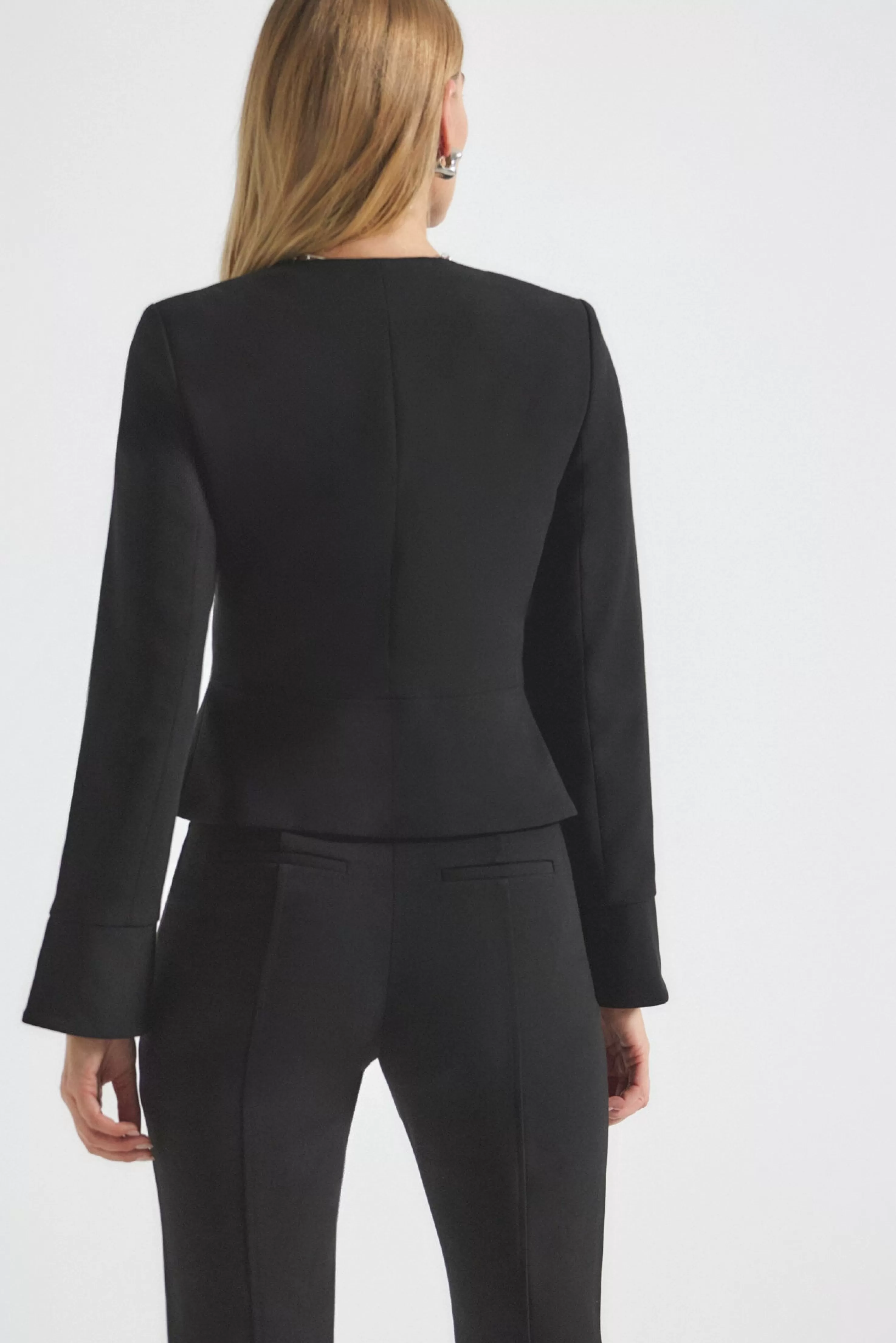 The Elizabeth Peplum jacket is a softly tailored style with slightly flared sleeves. It features a fitted silhouette with a cutaway detail and button closures.