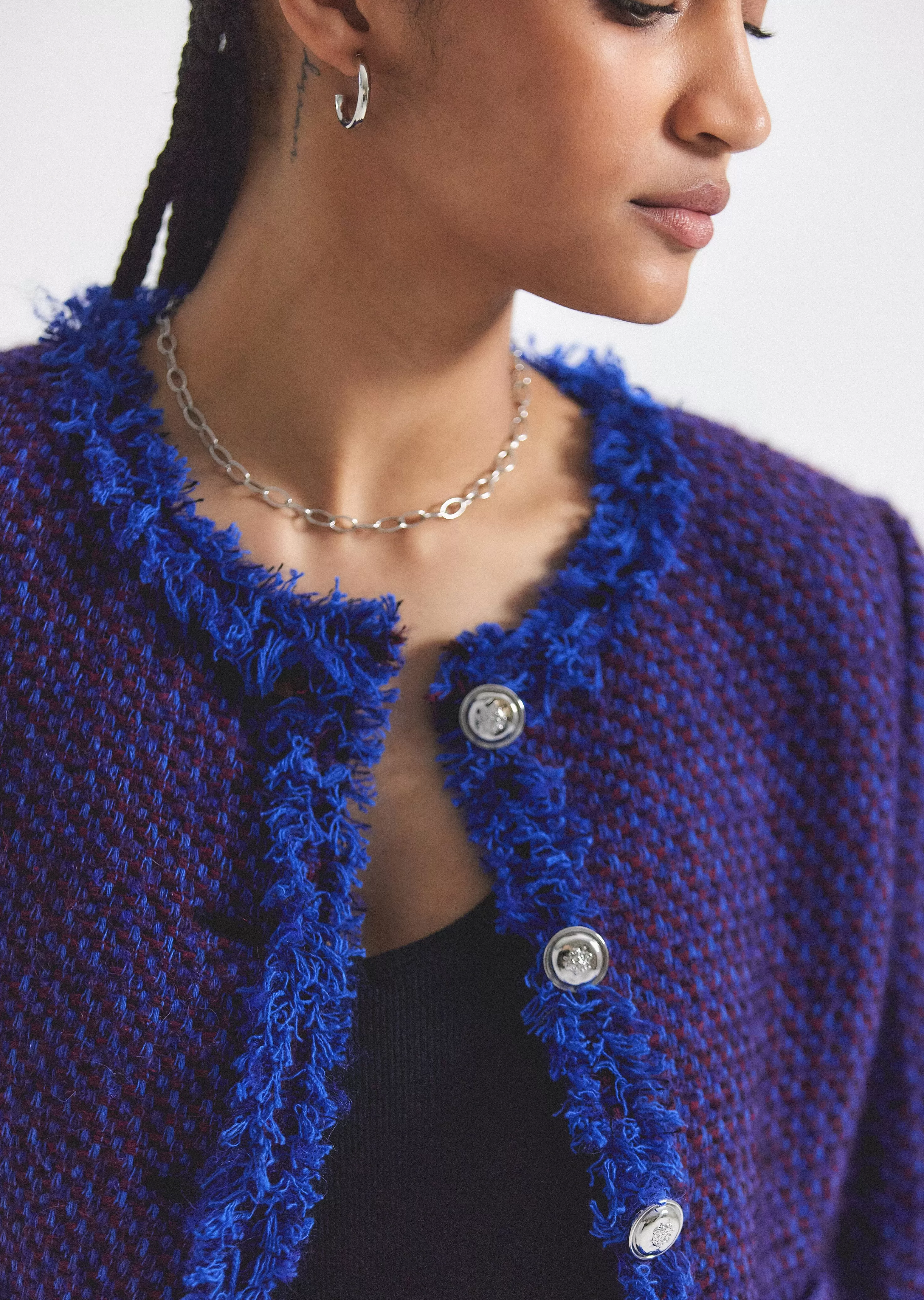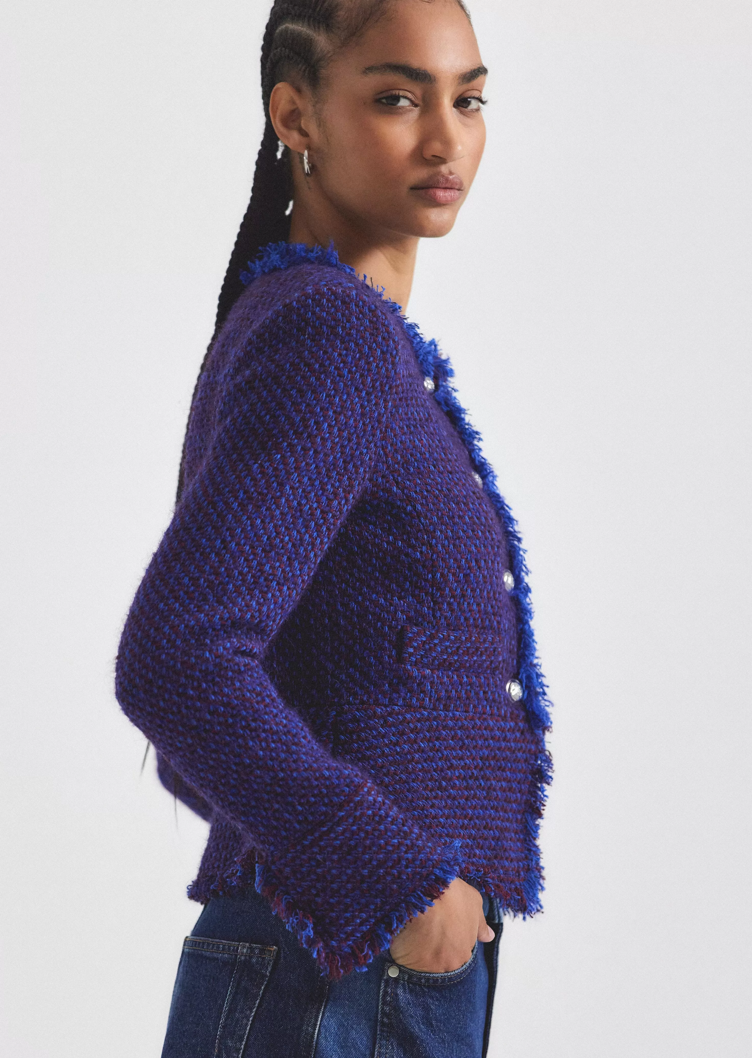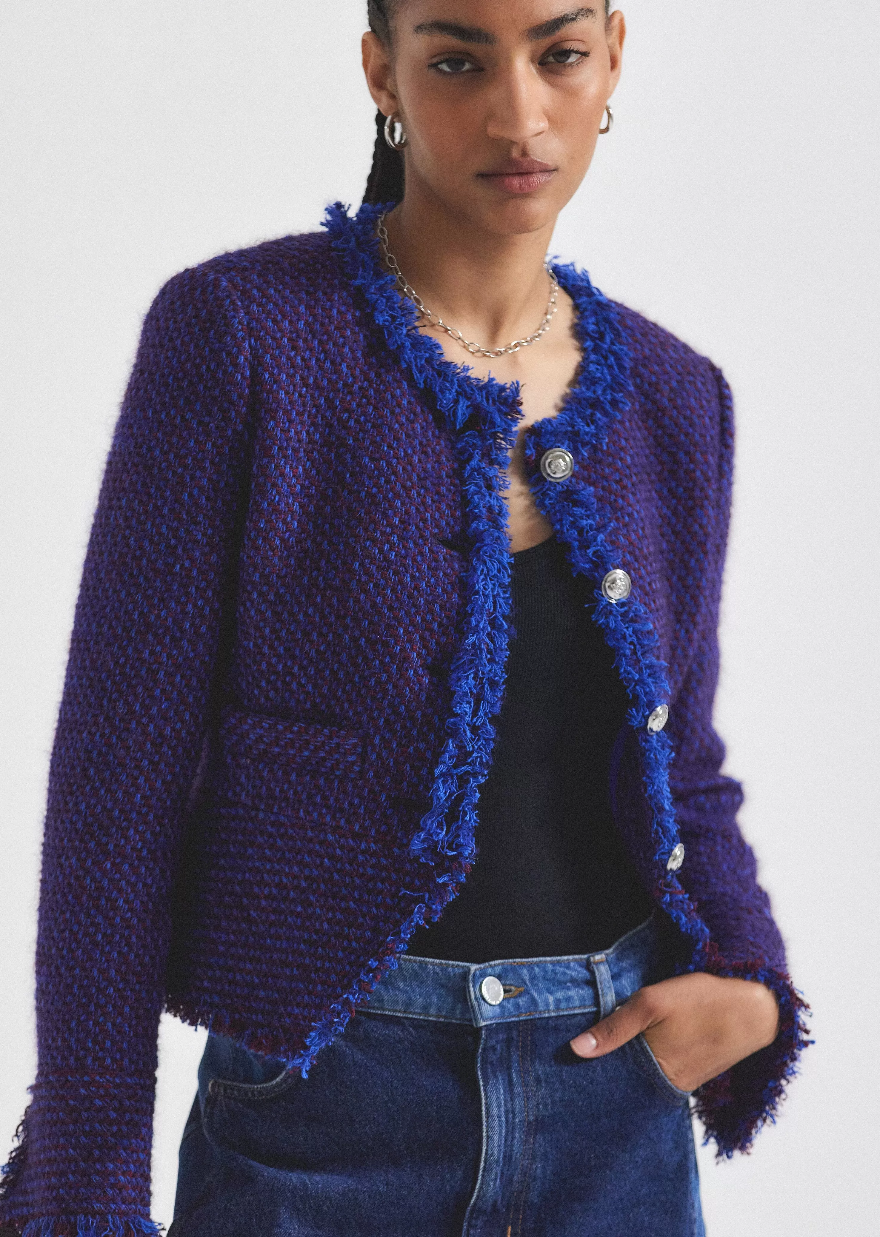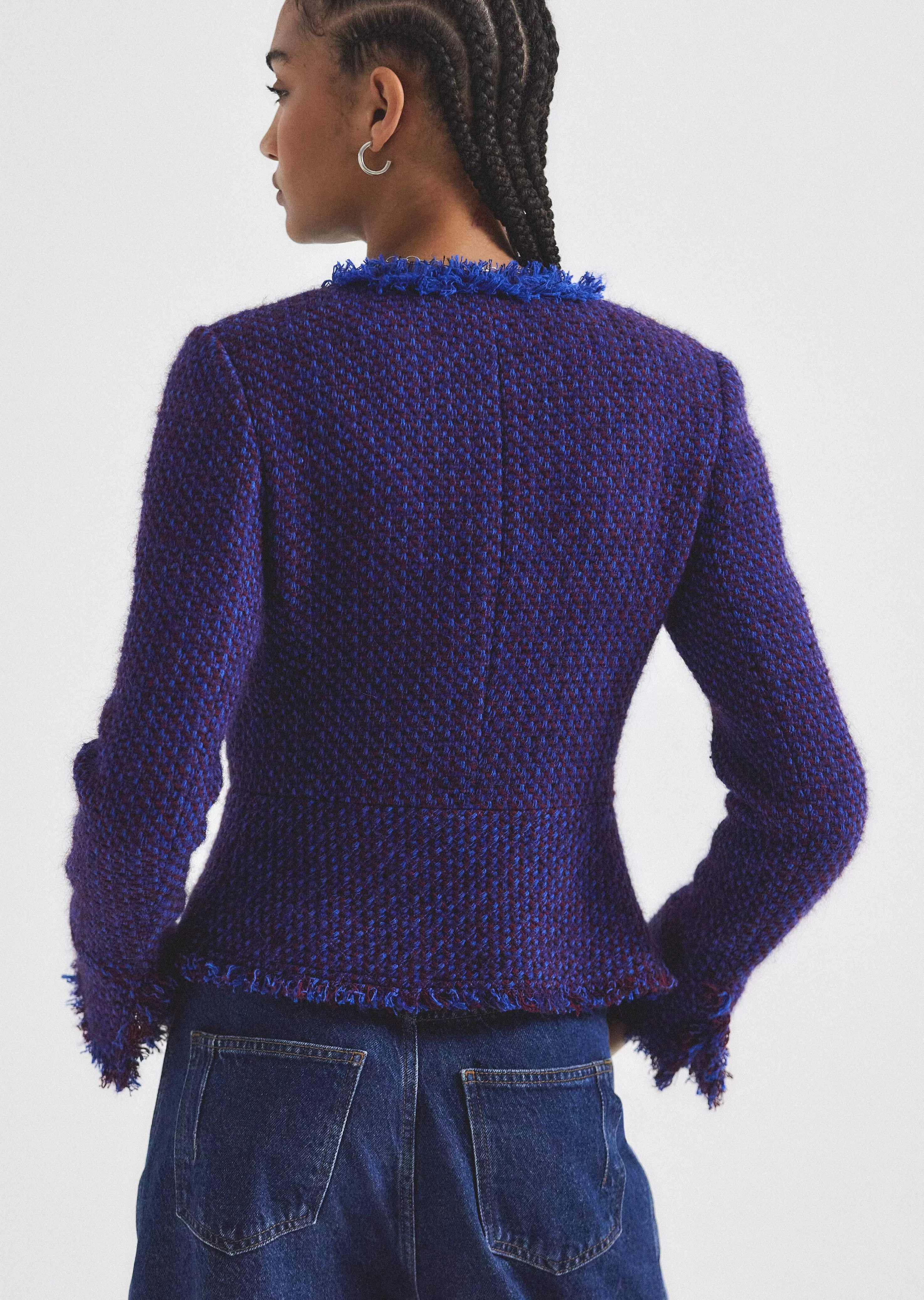 The Elizabeth Peplum jacket is a softly tailored style with slightly flared sleeves. It features a fitted silhouette with a cutaway detail with new fringed textured details.