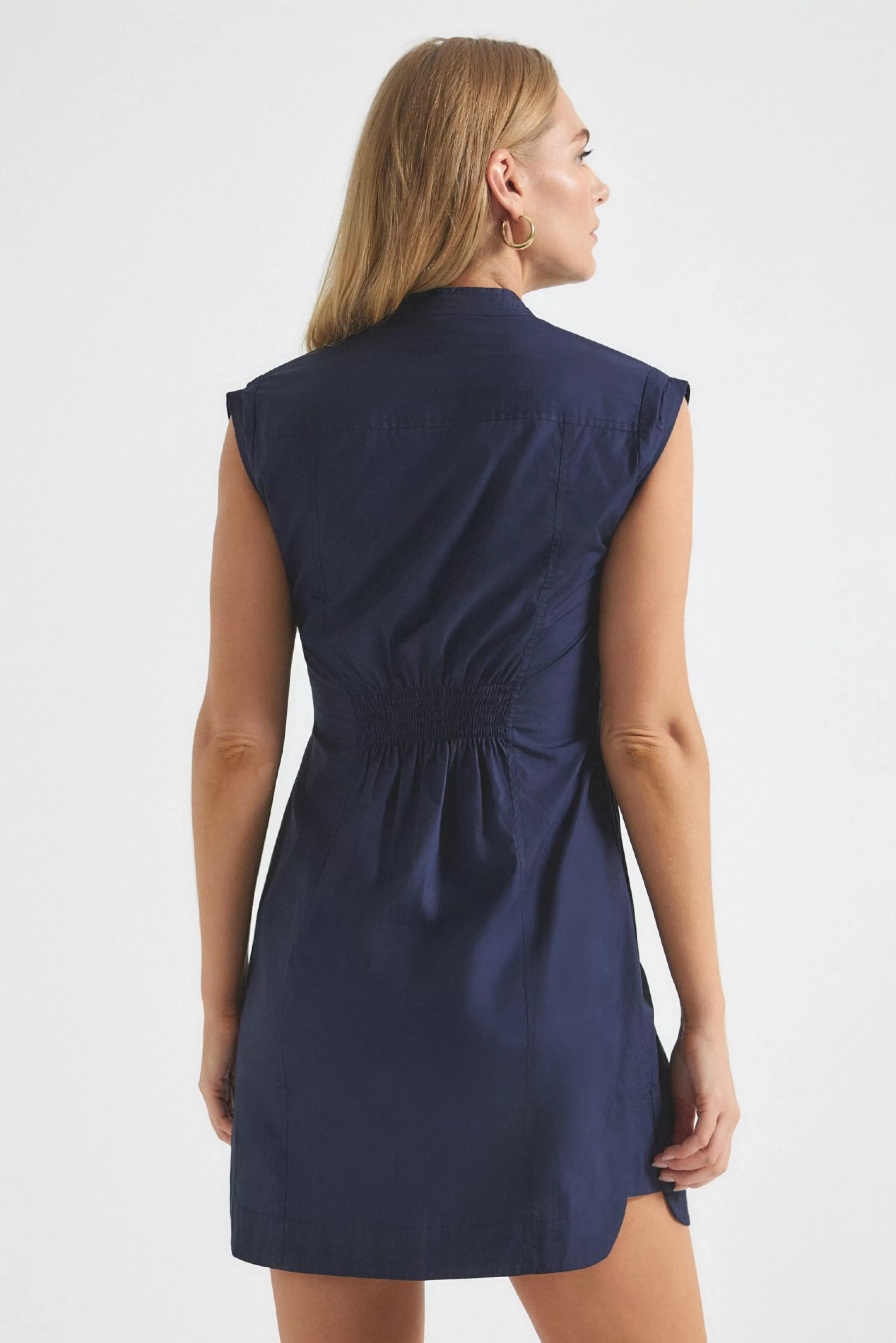 The Elyse Dress is a soft utility style crafted from cotton poplin. It features a slightly extended shoulder, rolled sleeves, and gathering at the side seams.