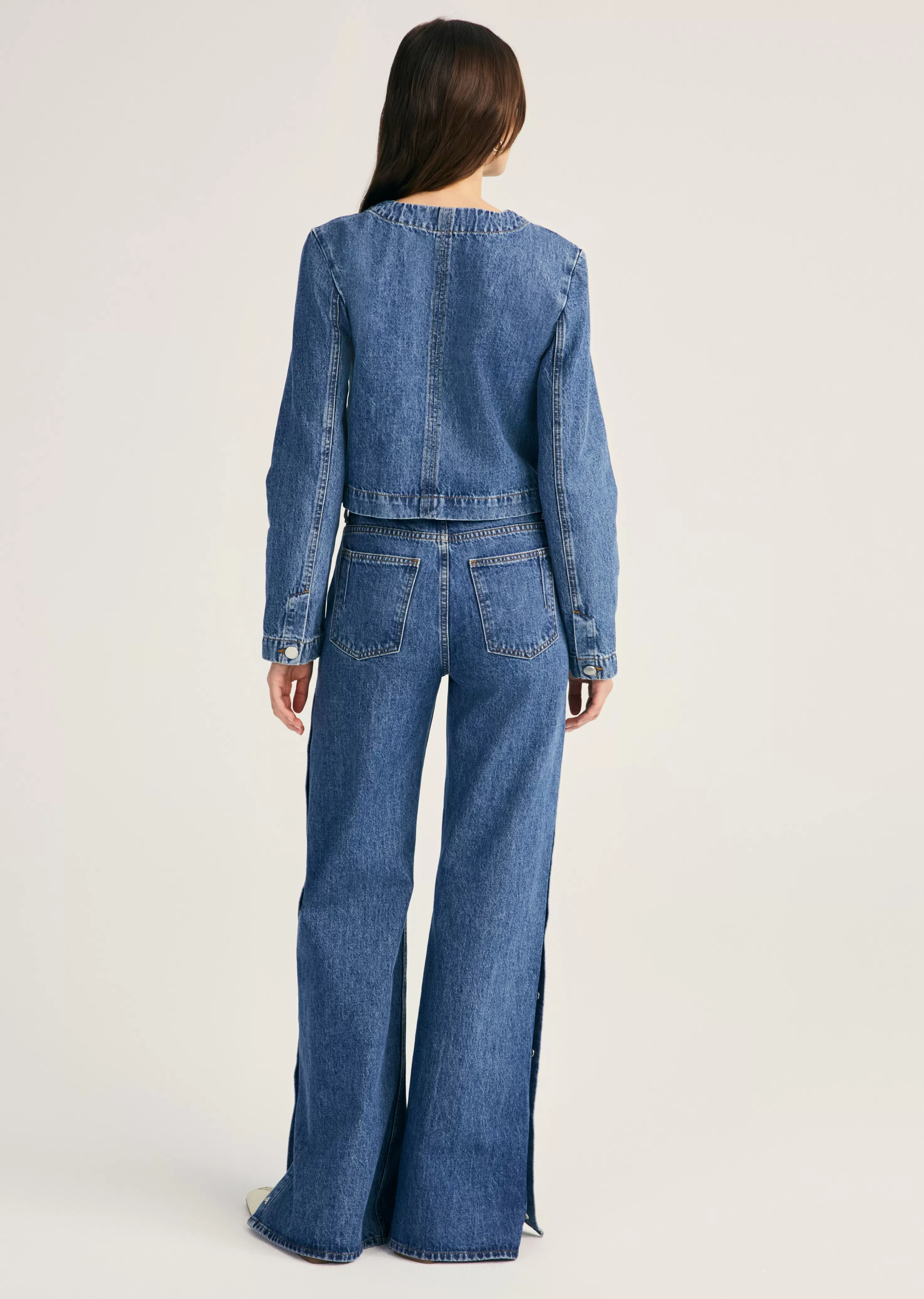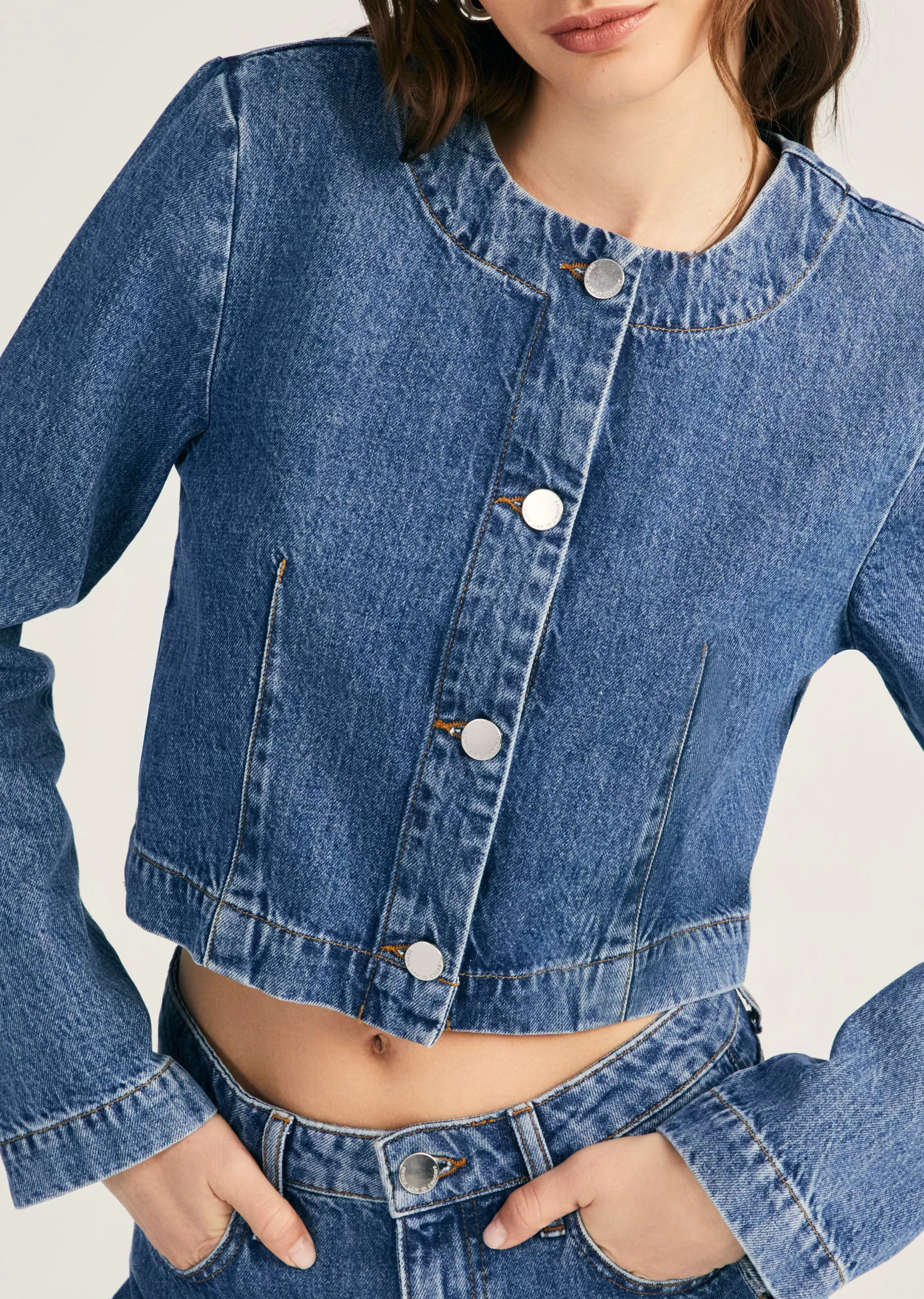 The Ezra Button Front Jacket is a softly structured piece crafted from premium 100% classic cotton. It features a fitted silhouette with a tailored look. Part of a set with matching jeans.