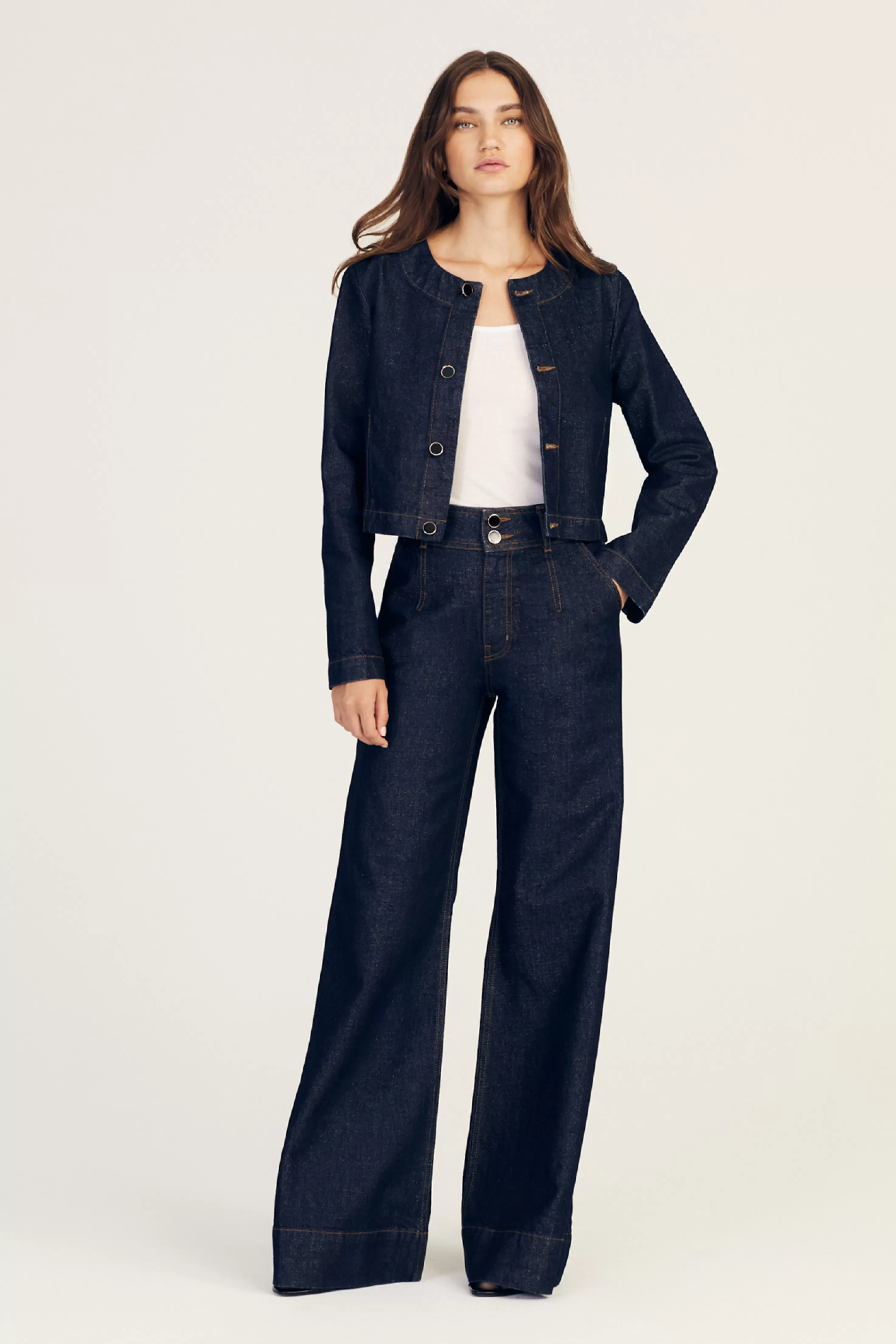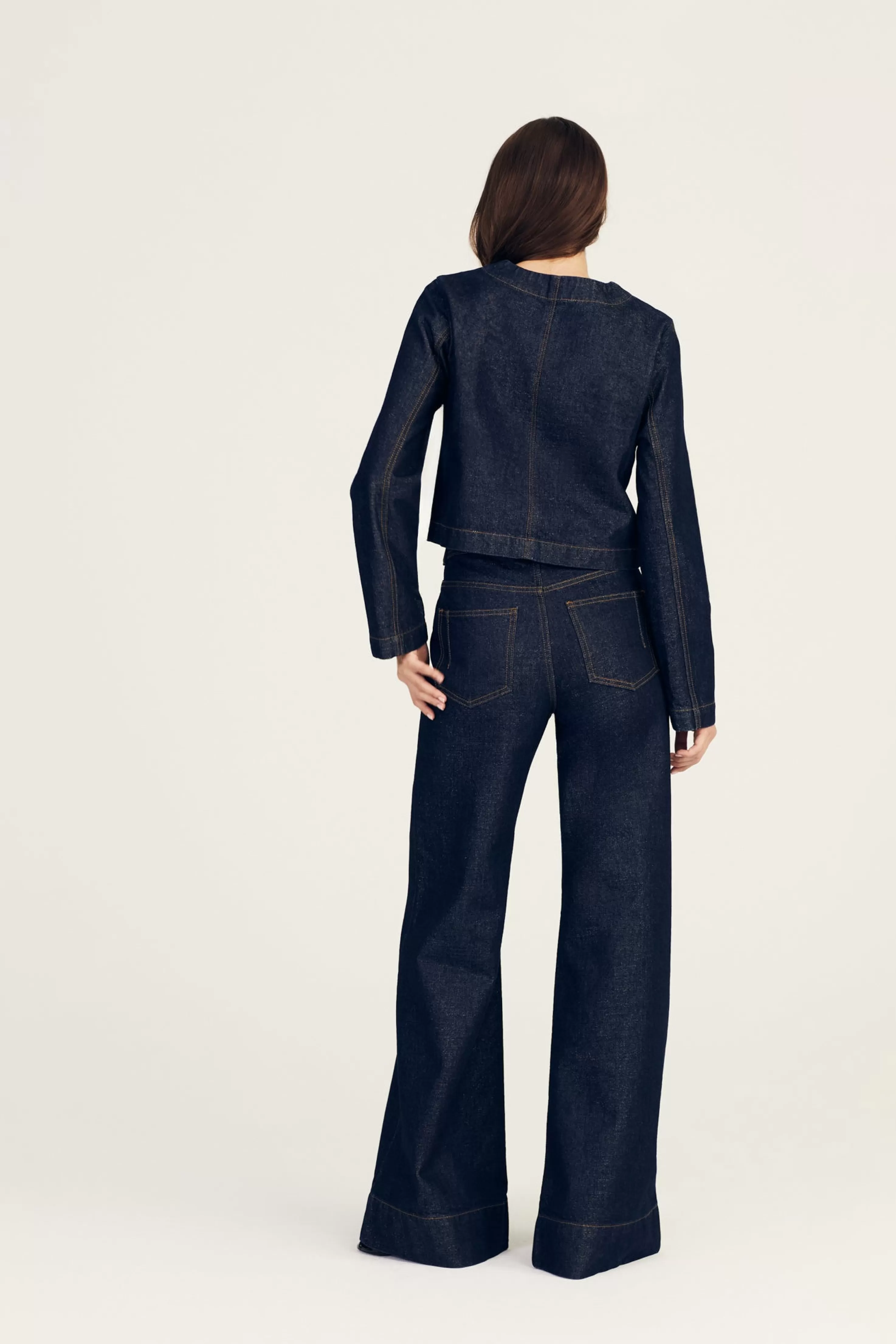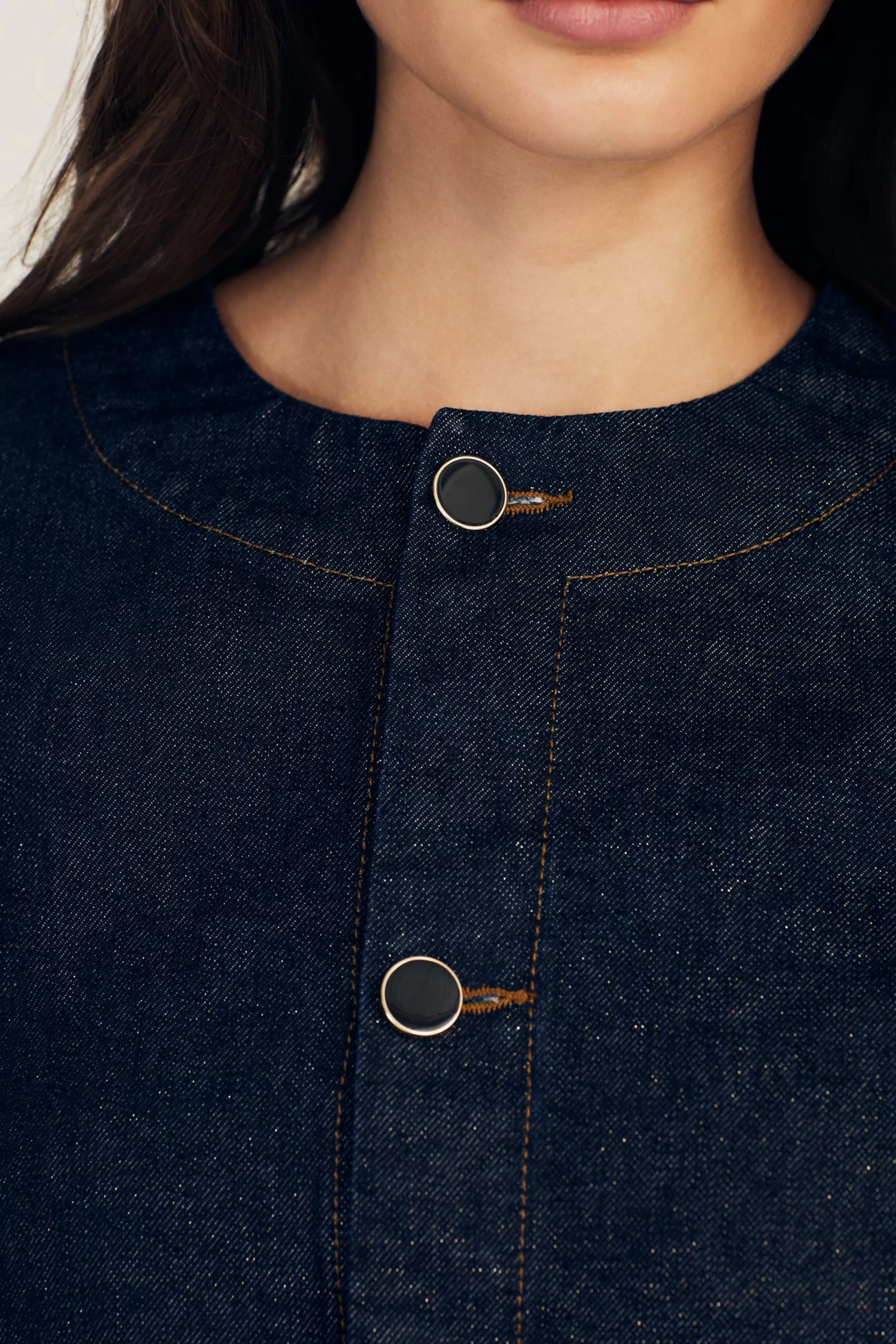 The Ezra Button Front Jacket is a softly structured piece crafted from premium 100% classic cotton. It features a tailored silhouette with a shimmering new take on our deep wash with soft lurex woven into the fibers. The subtle gold treatment is only reflected the in light. Part of a set with matching trousers.