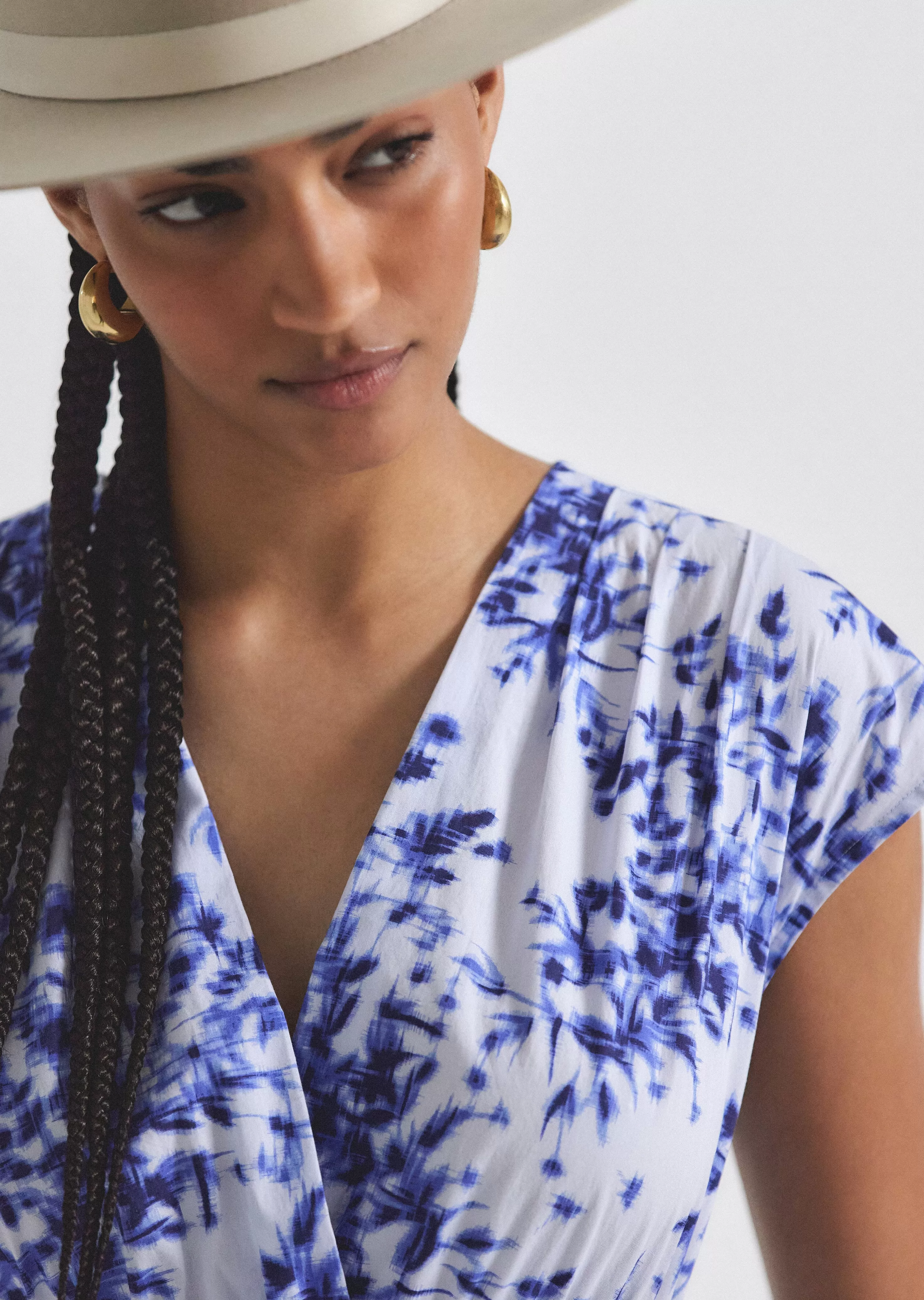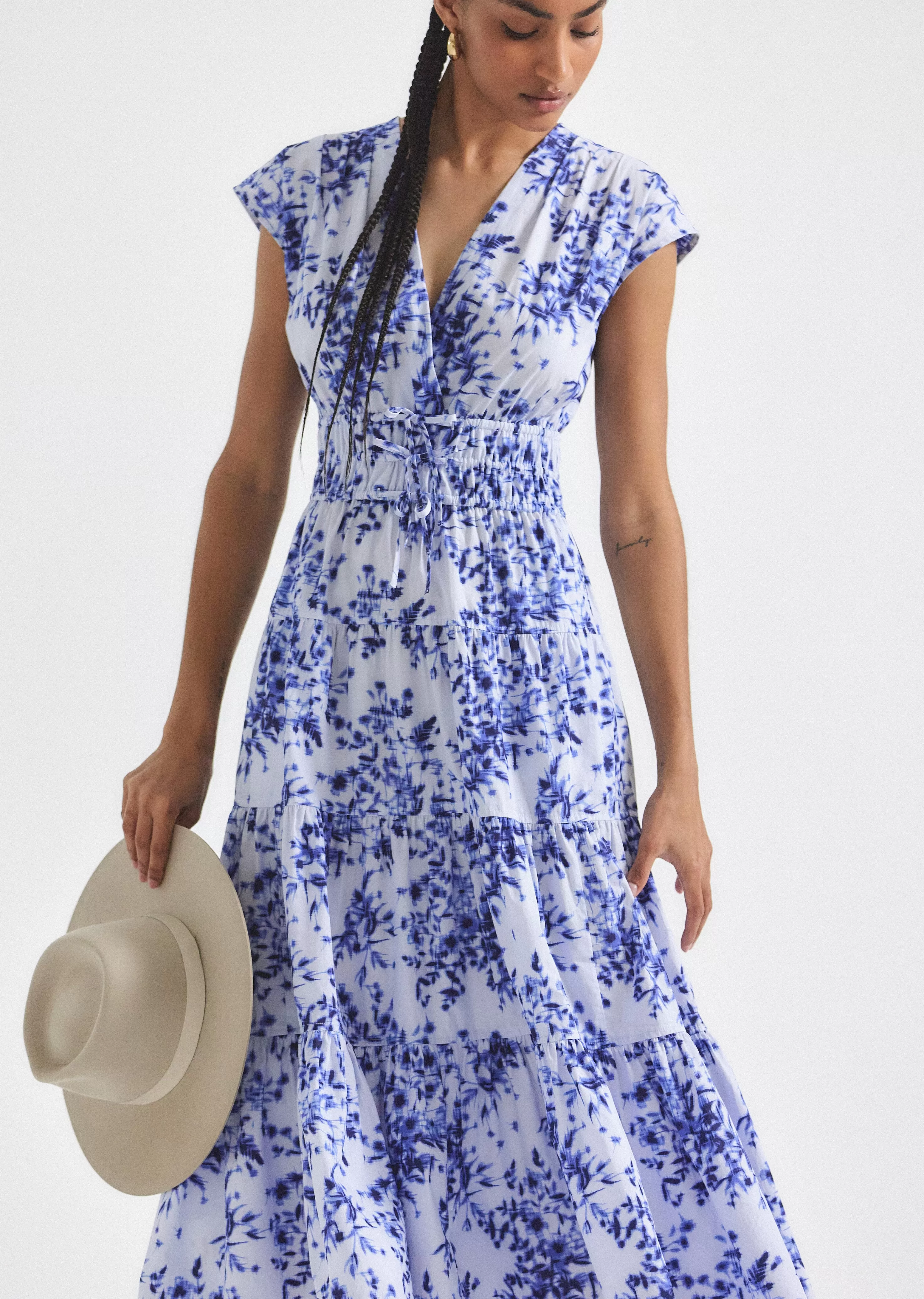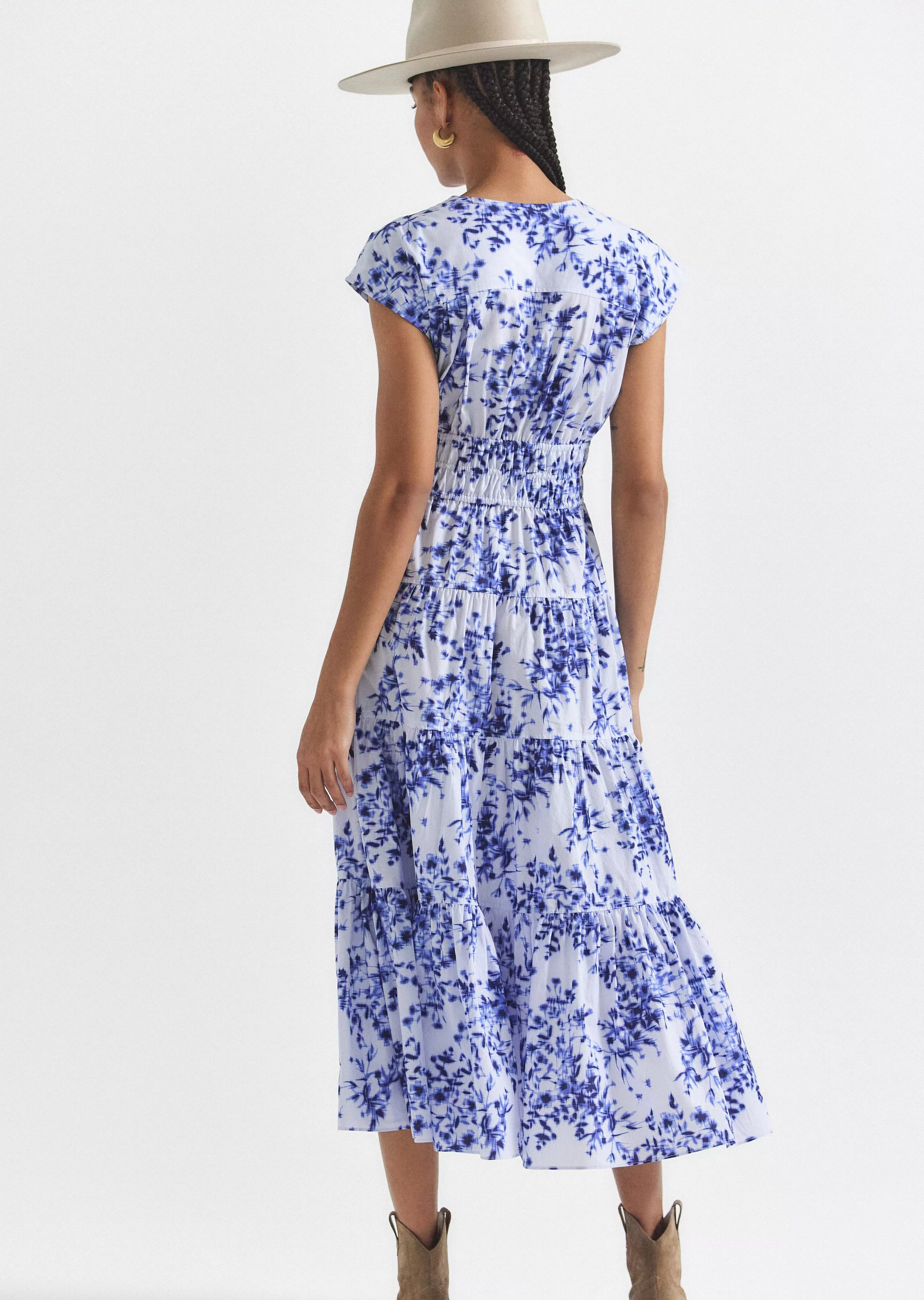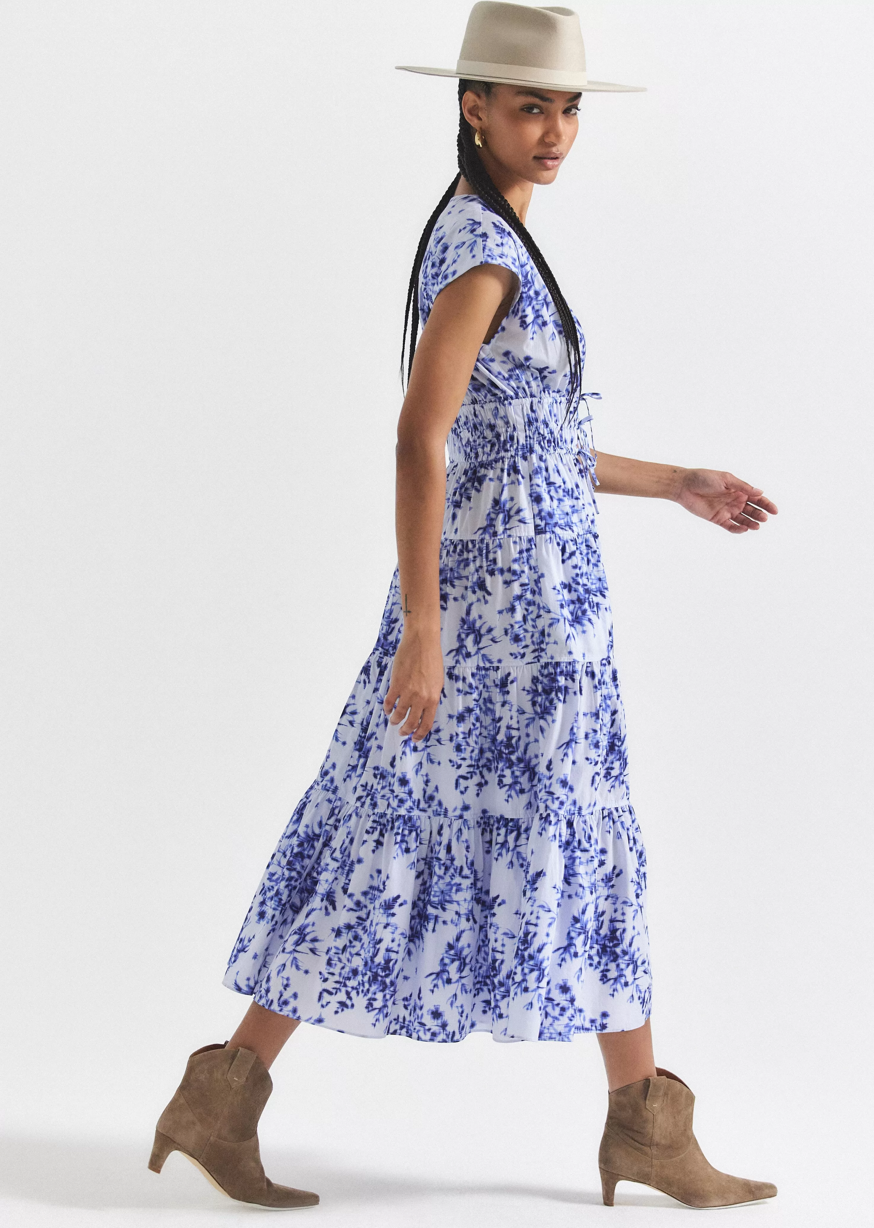 The Fatima Dress is a Derek Lam 10 Crosby classic reimagined in a seasonal print. It features a slightly extended shoulder, gathered waist, and fluid silhouette.