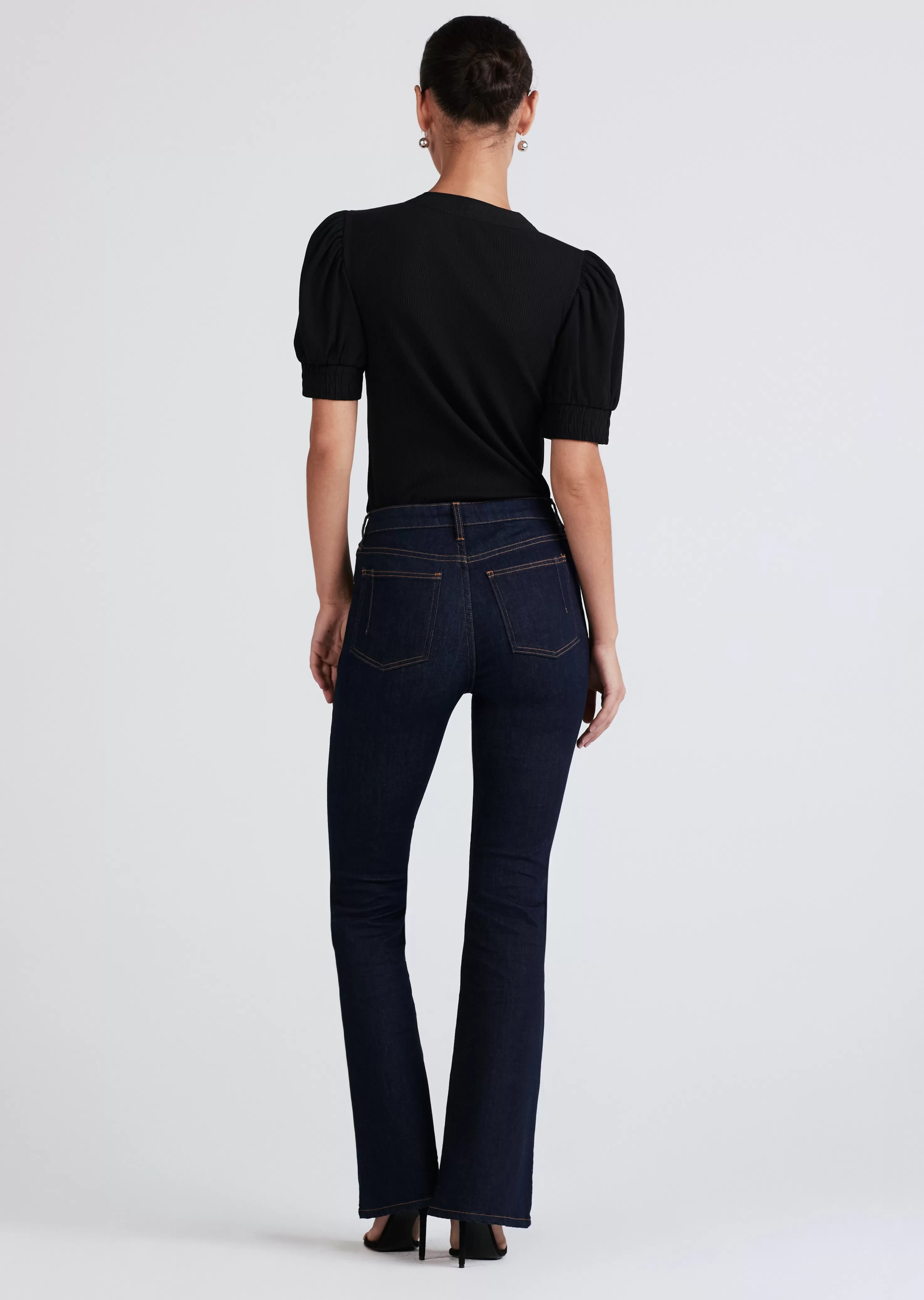 The Heather V-Neck Puff Sleeve T-Shirt is crafted from a soft stretch cotton with a ribbed texture. It features a V-neckline with cotton poplin button-down placket and short puff sleeves with elastic cuffs.