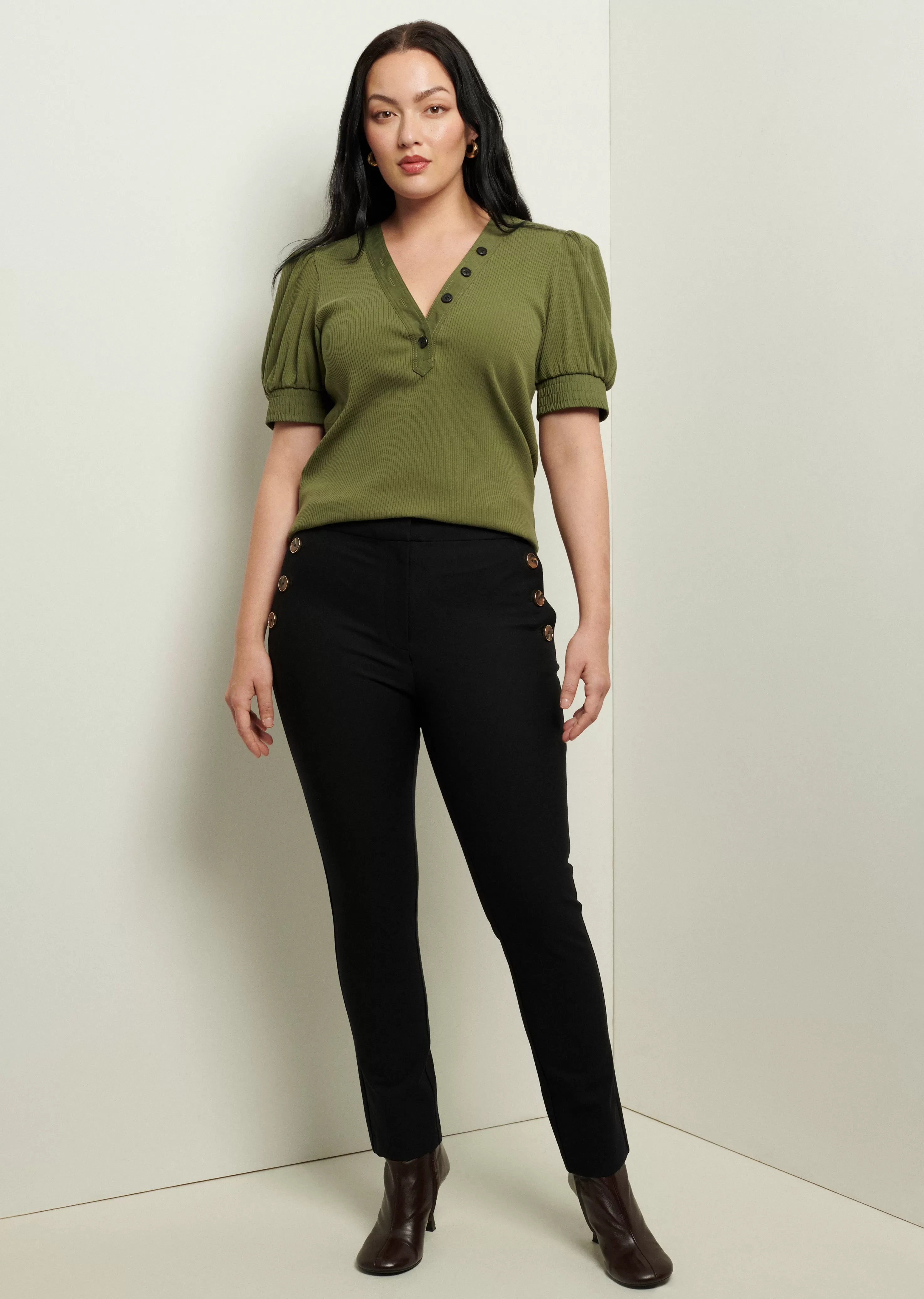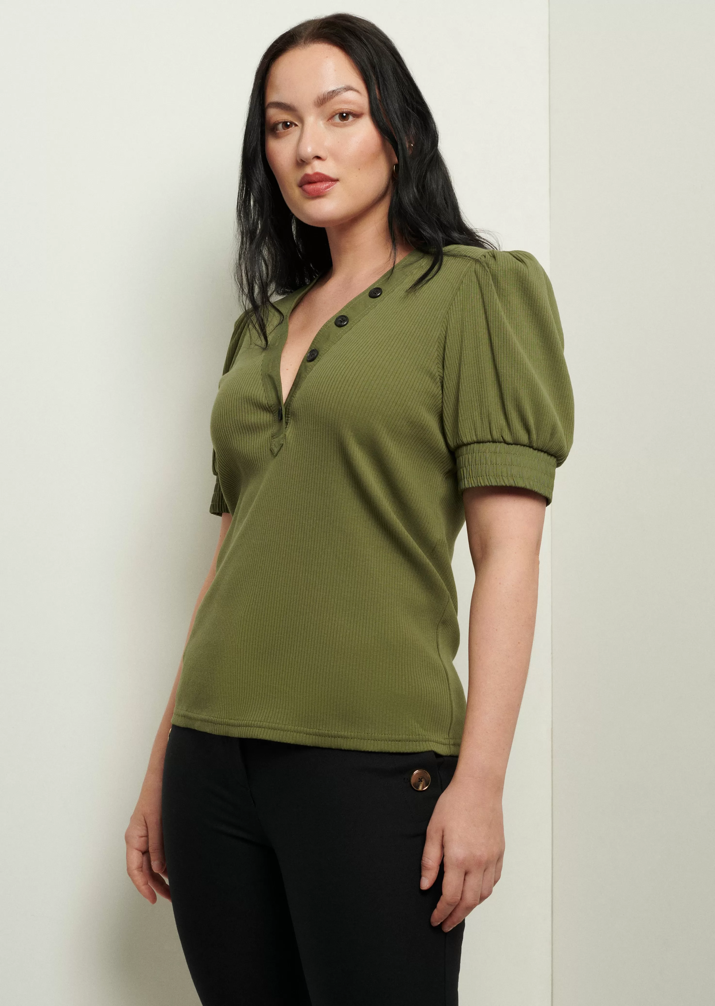 The Heather V-Neck Puff Sleeve T-Shirt is crafted from a soft stretch cotton with a ribbed texture. It features a V-neckline with cotton poplin button-down placket and short puff sleeves with elastic cuffs.