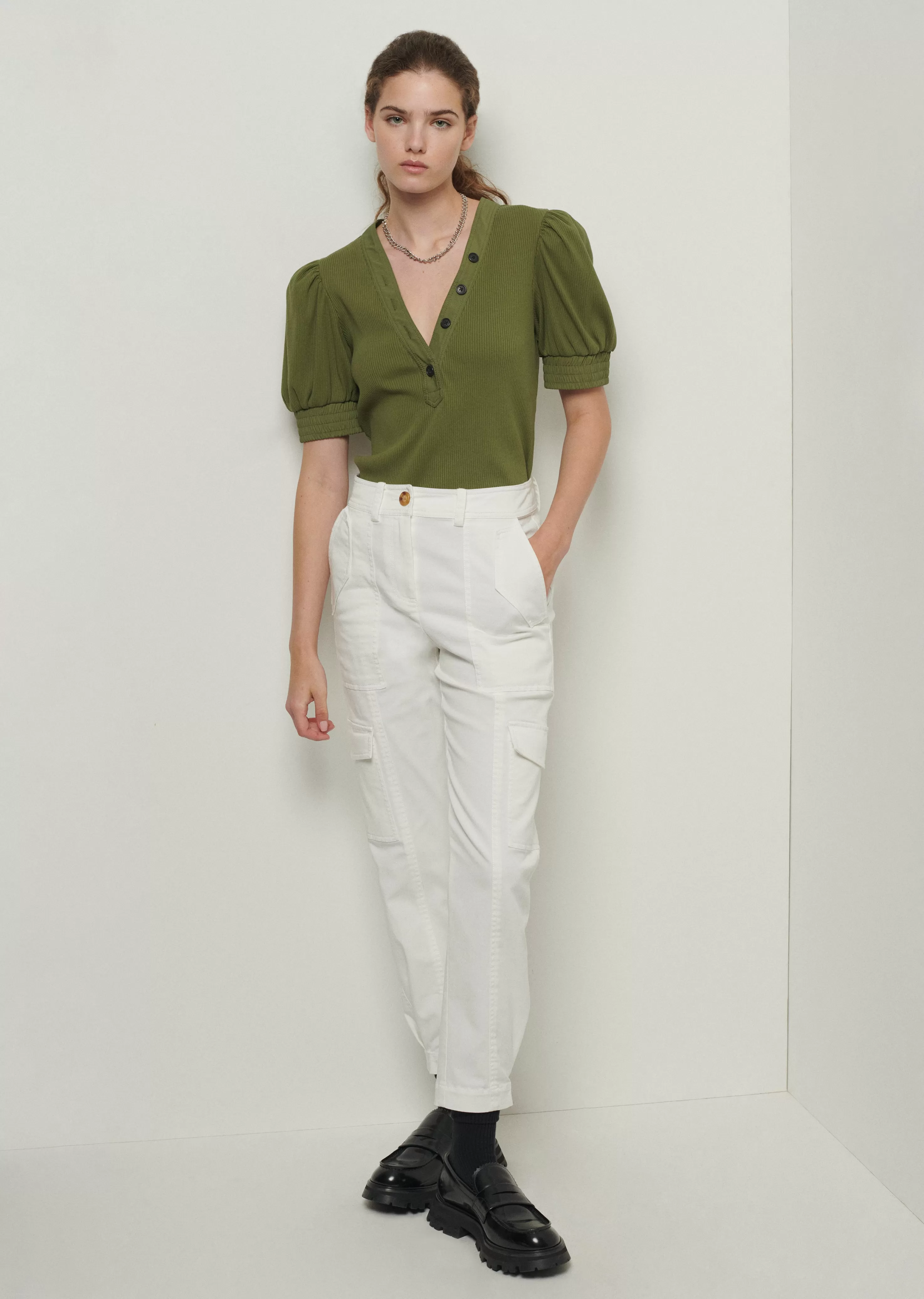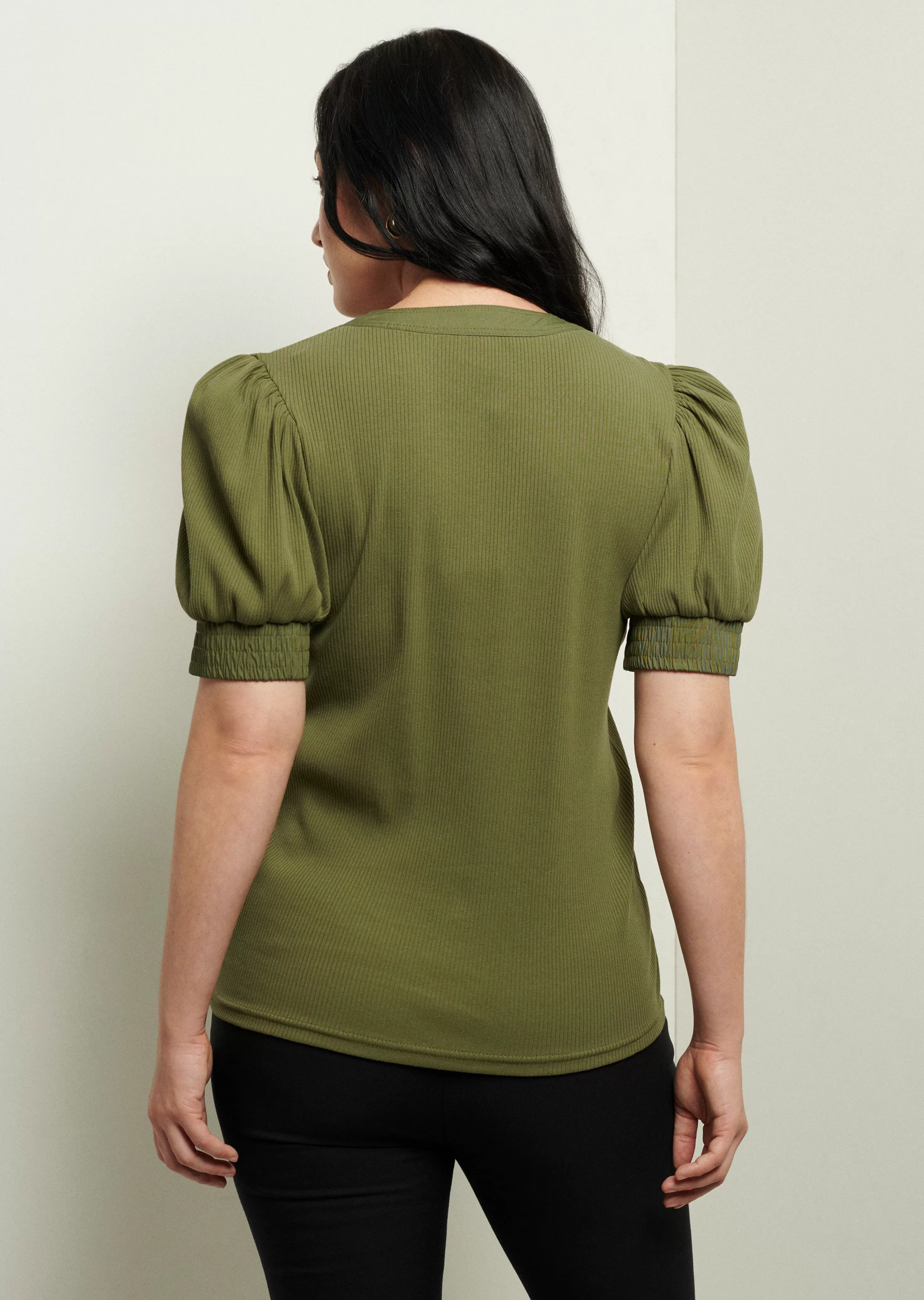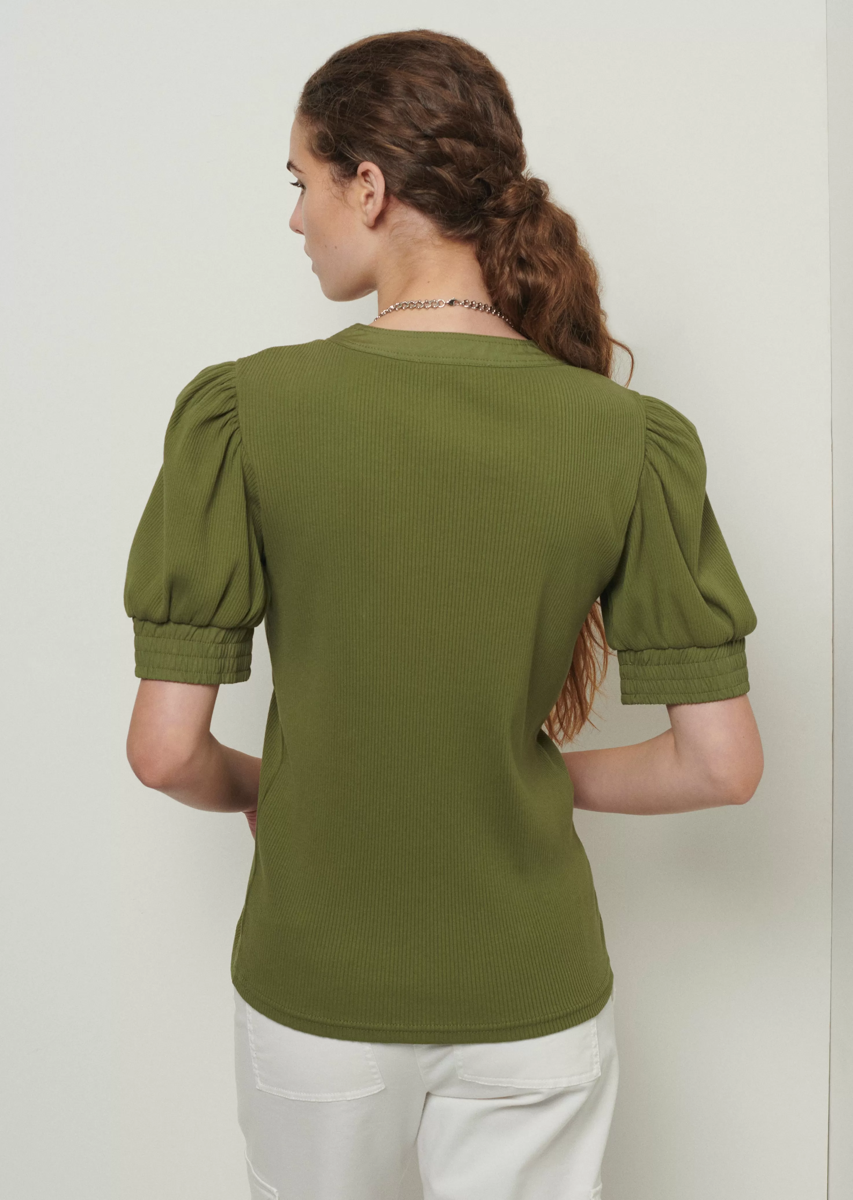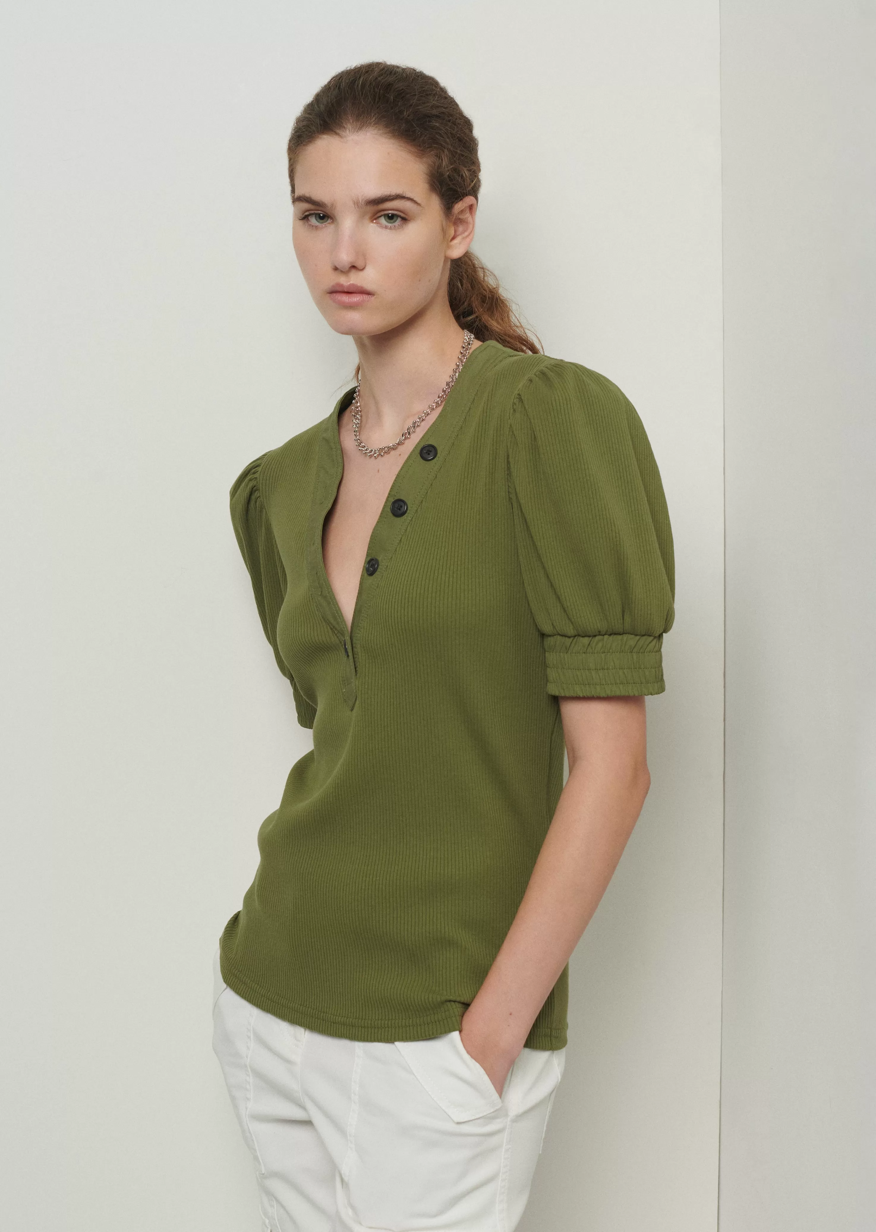 Derek Lam Heather V-Neck Puff Sleeve T-Shirt Olive Clearance