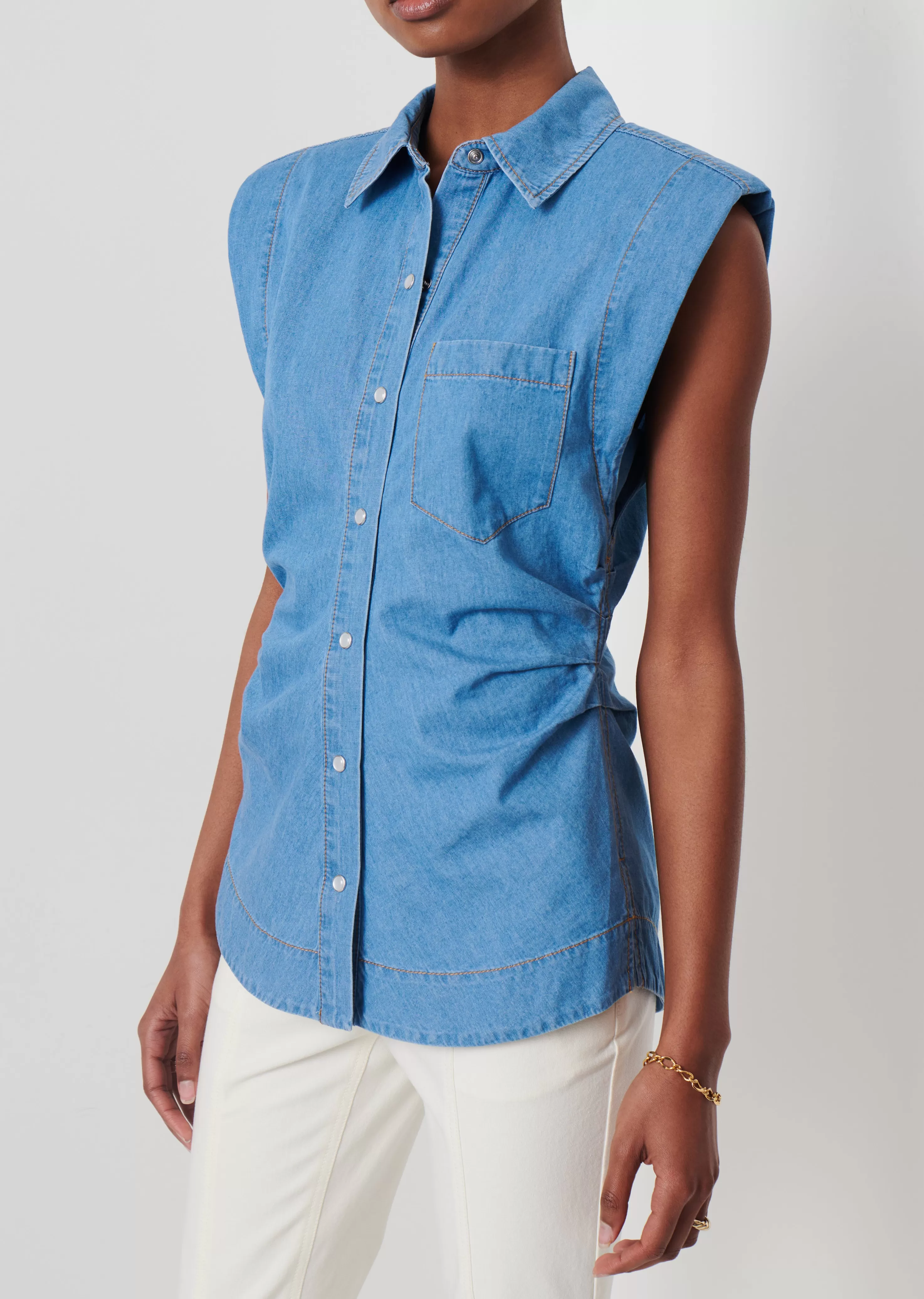 Derek Lam Ivy Sleeveless Ruched Button Down Shirt Lightwash Fashion