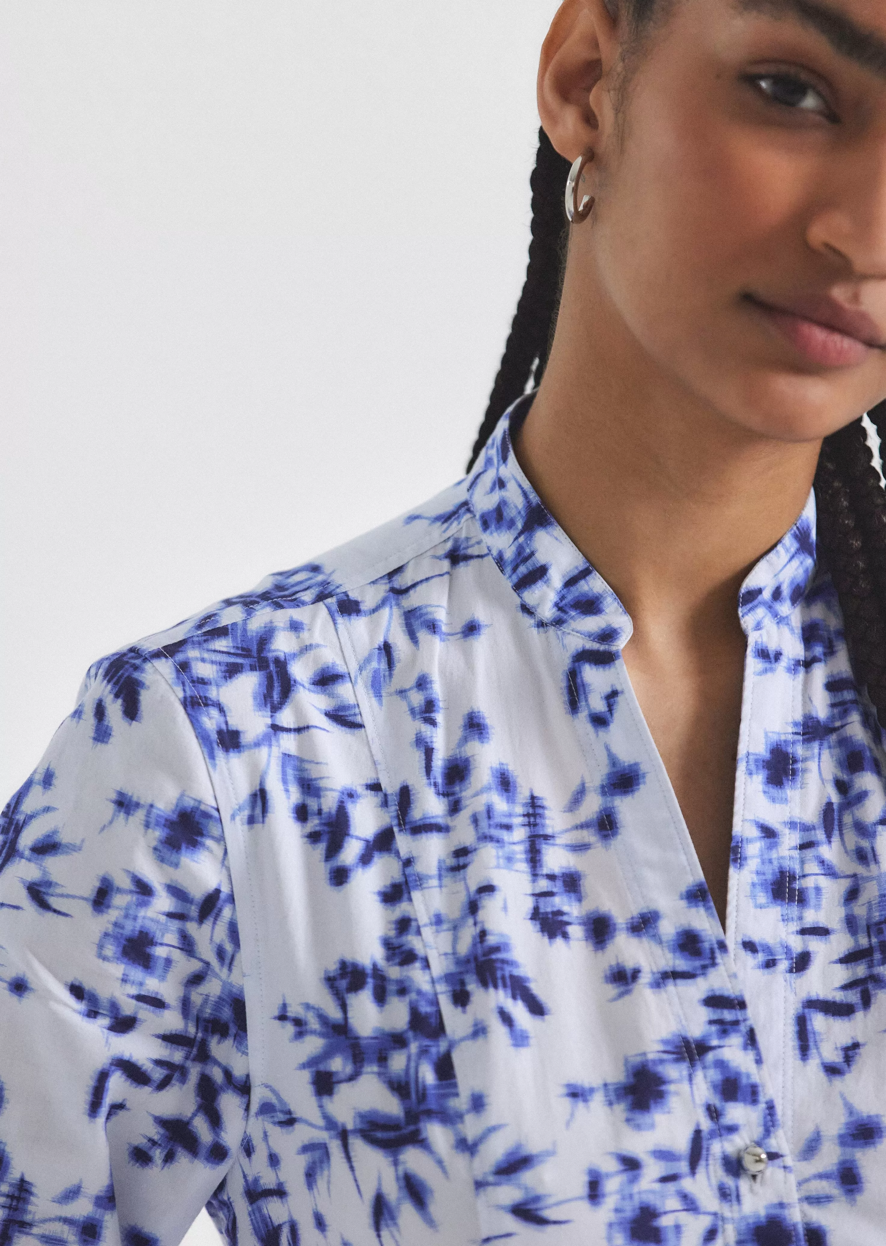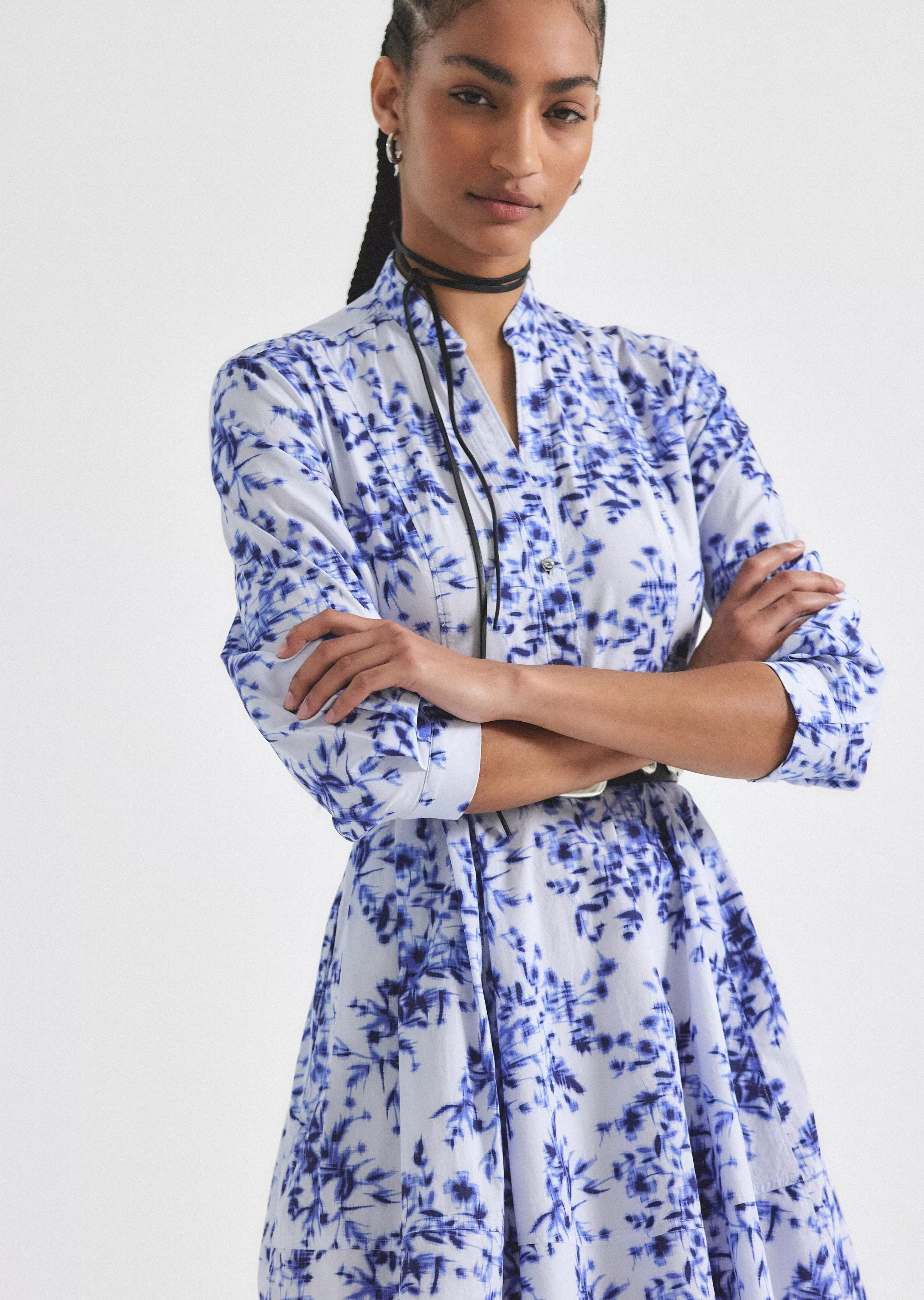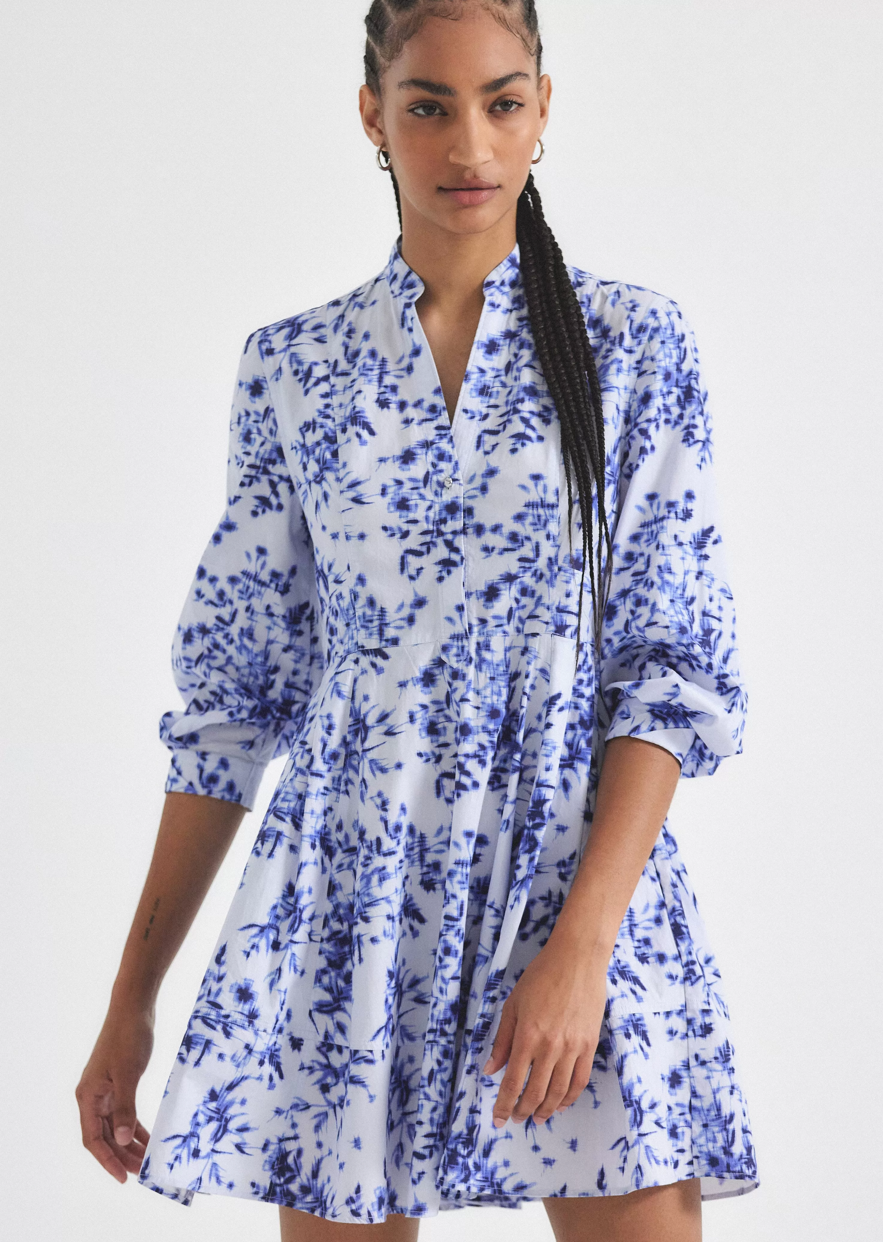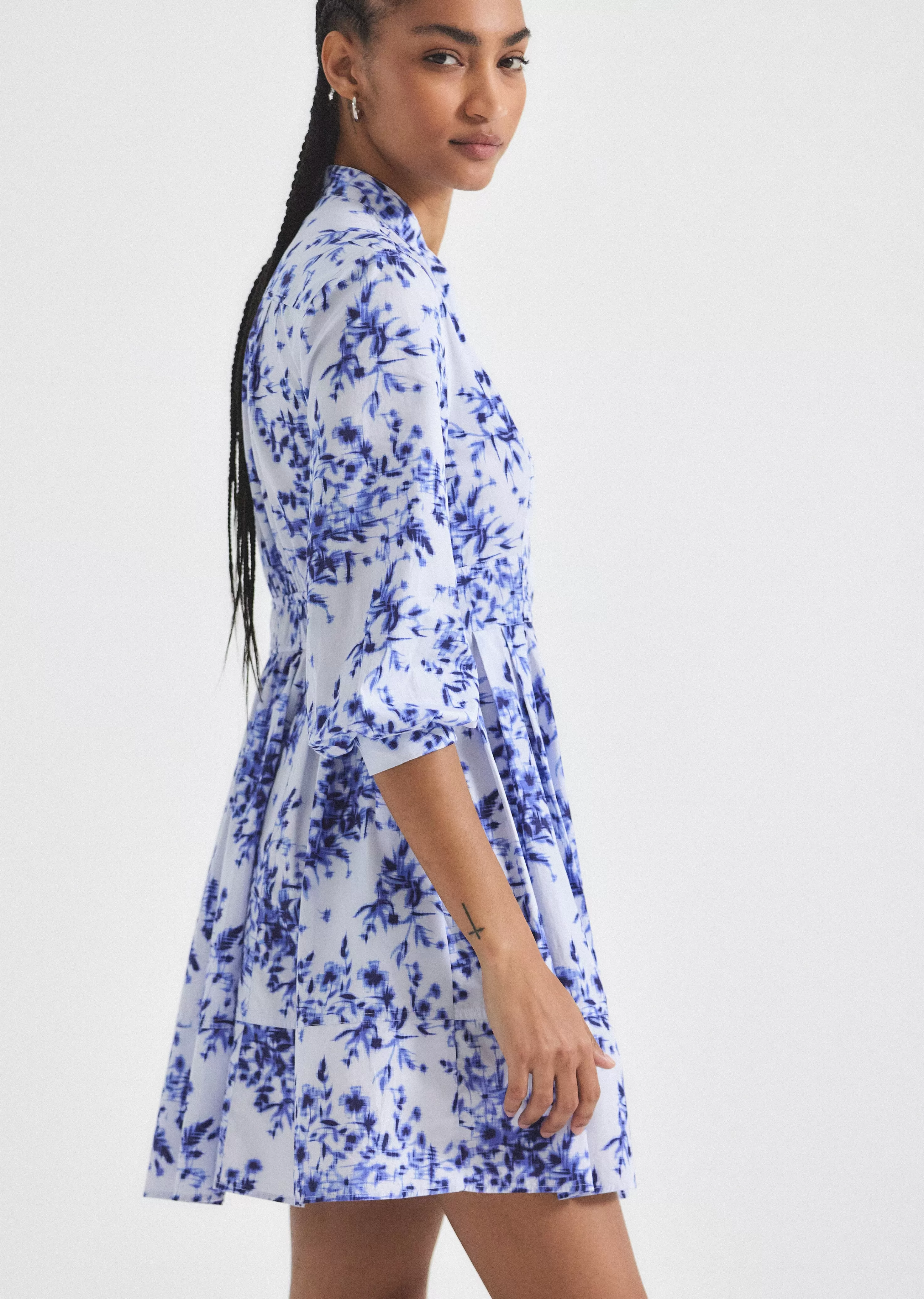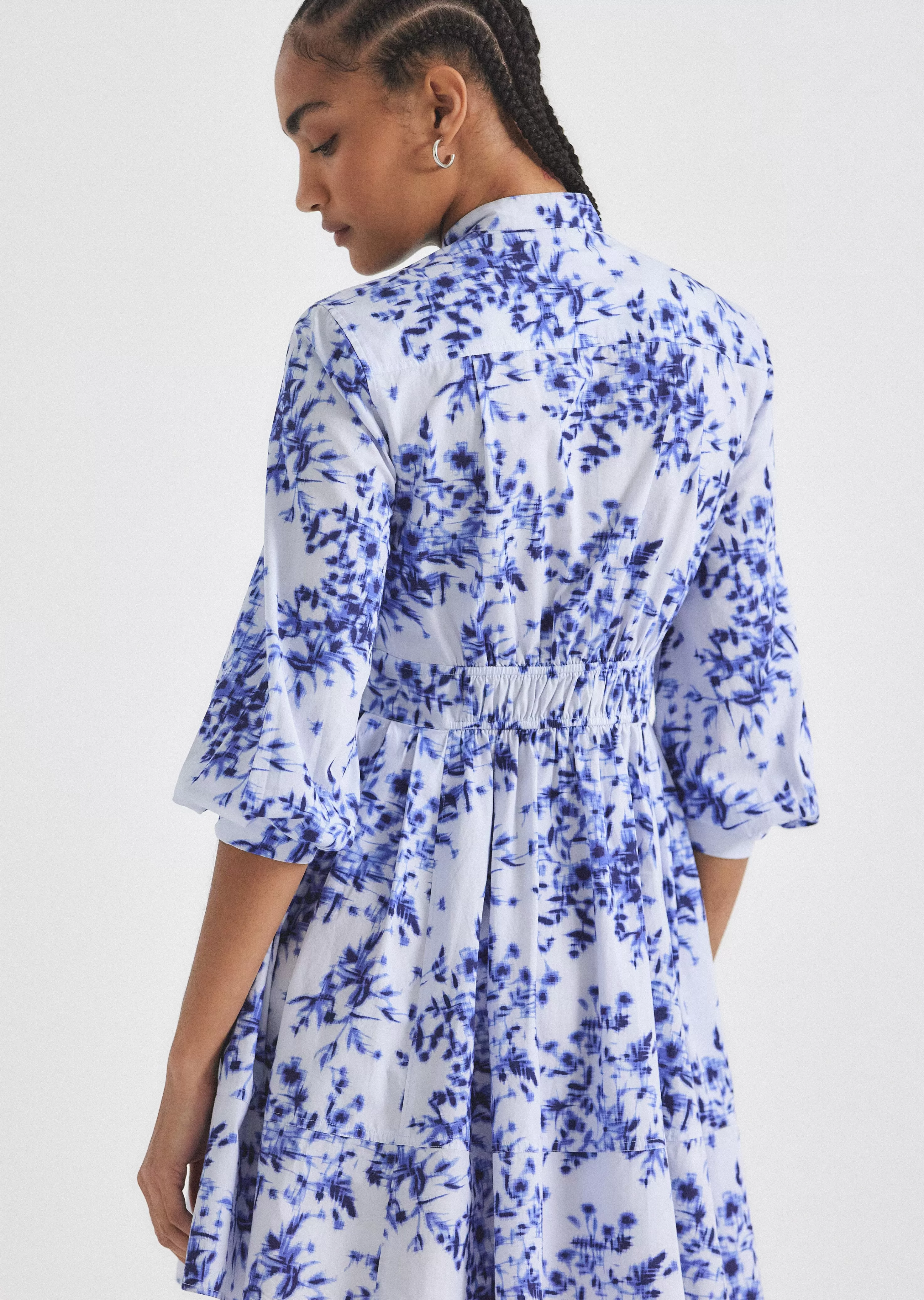 The Jessica Mini Dress is an A-line style crafted with smocking on the back. It features an exposed button, a hidden placket and wide facing cuffs.