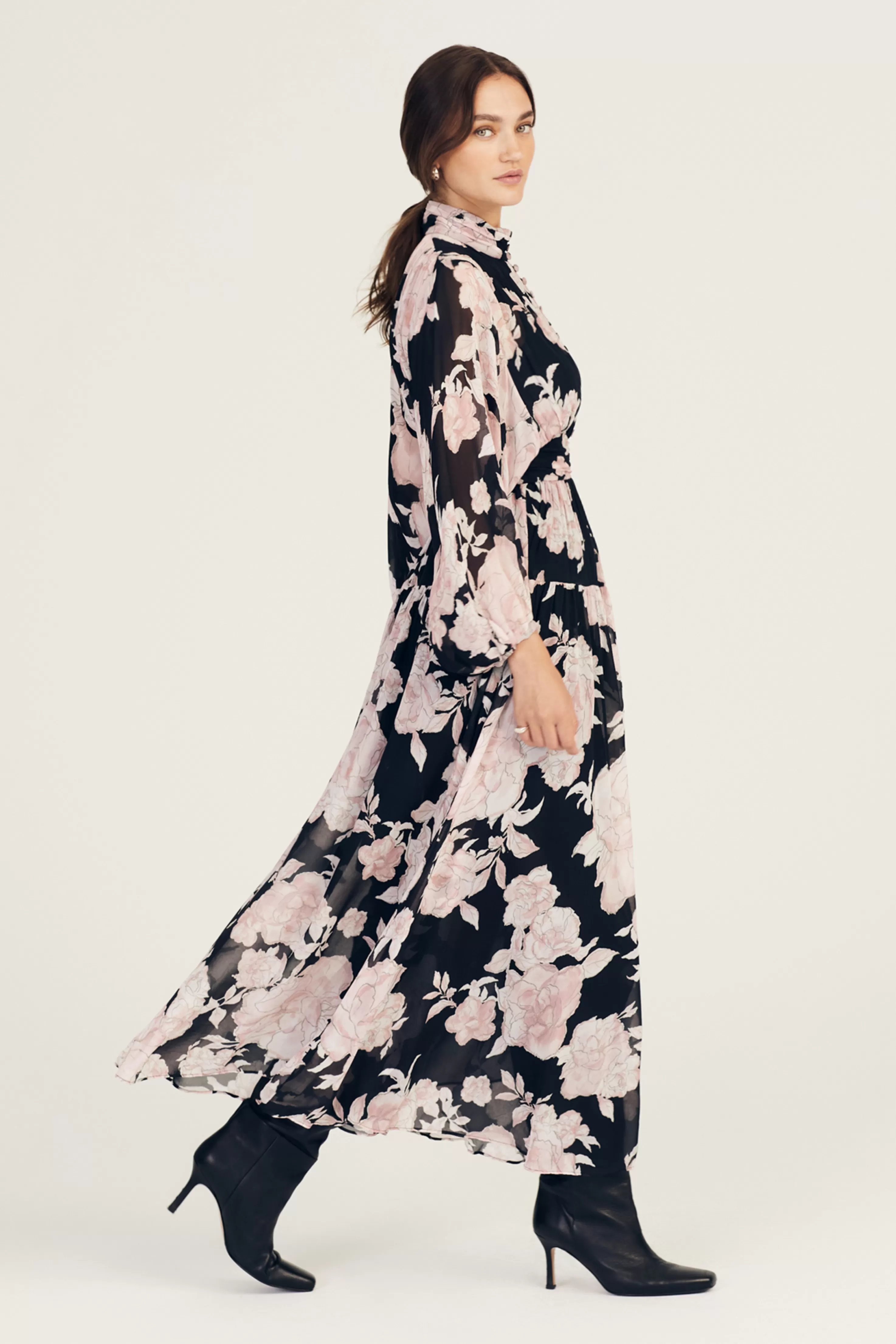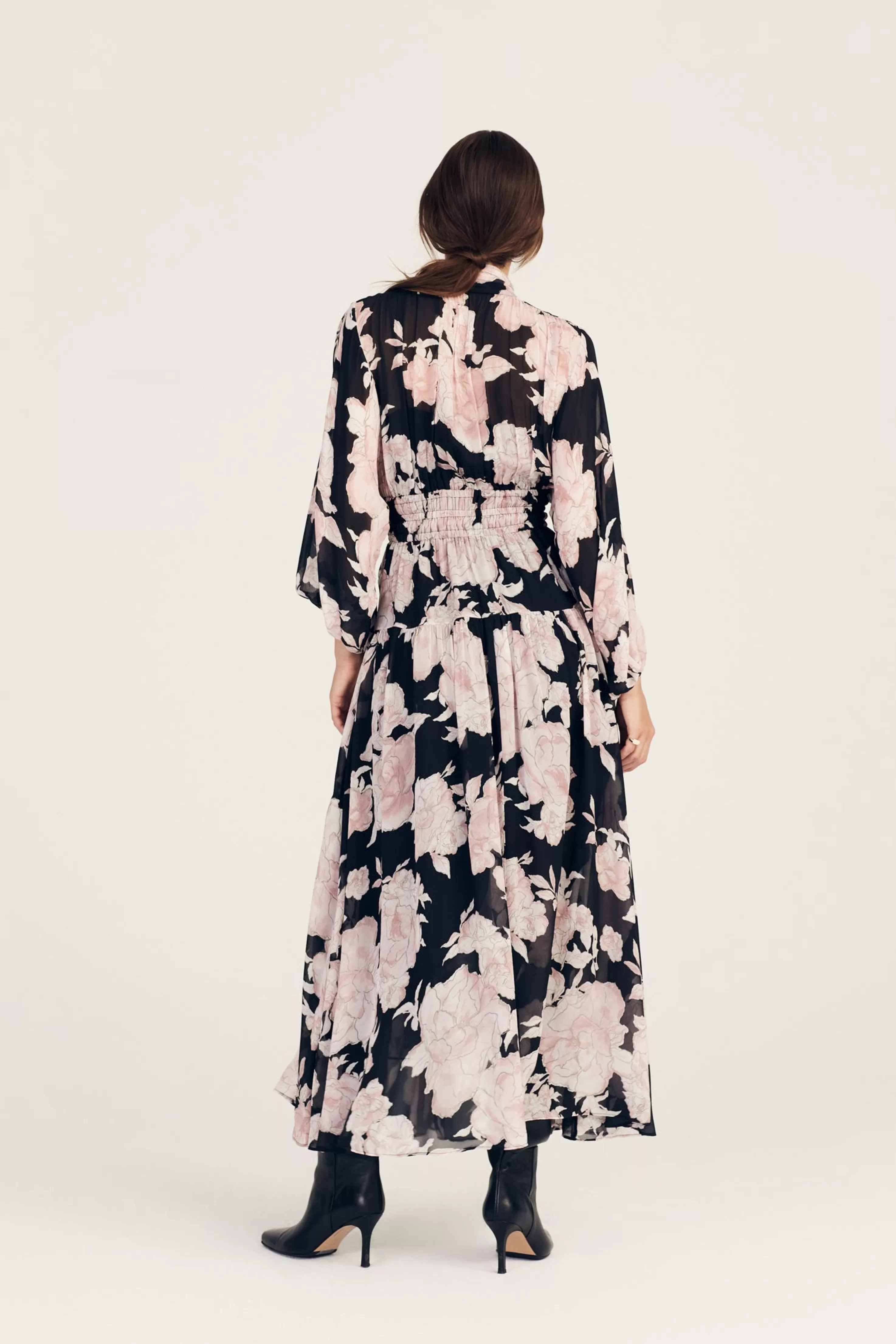 The Jolie Midi Dress is an elegantly draped style complete with bat sleeves, a ruched mock neck, and a full skirted silhouette. It features self-covered buttons, encased elastic on the back waist. The airy dress features a custom print developed in-house.