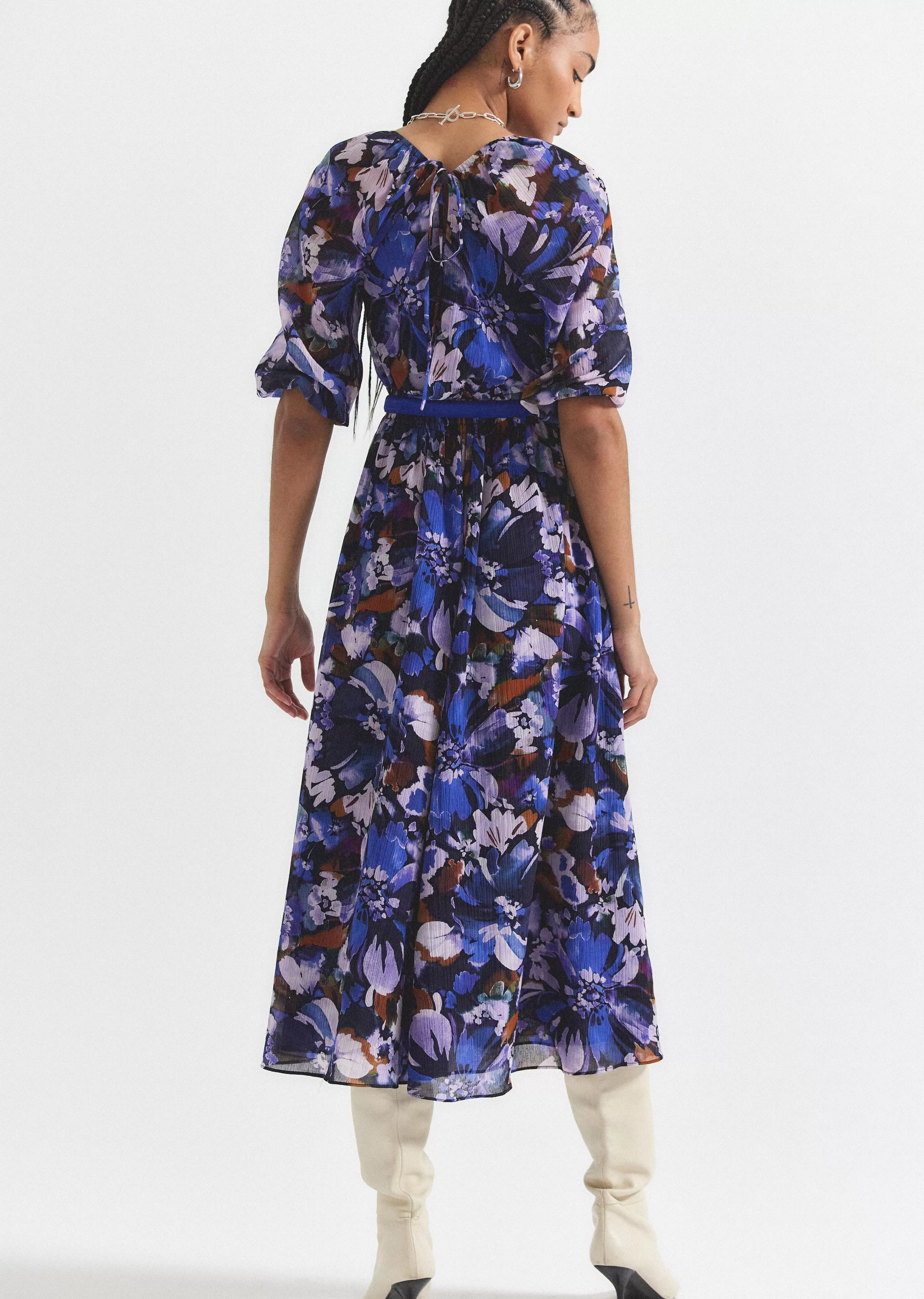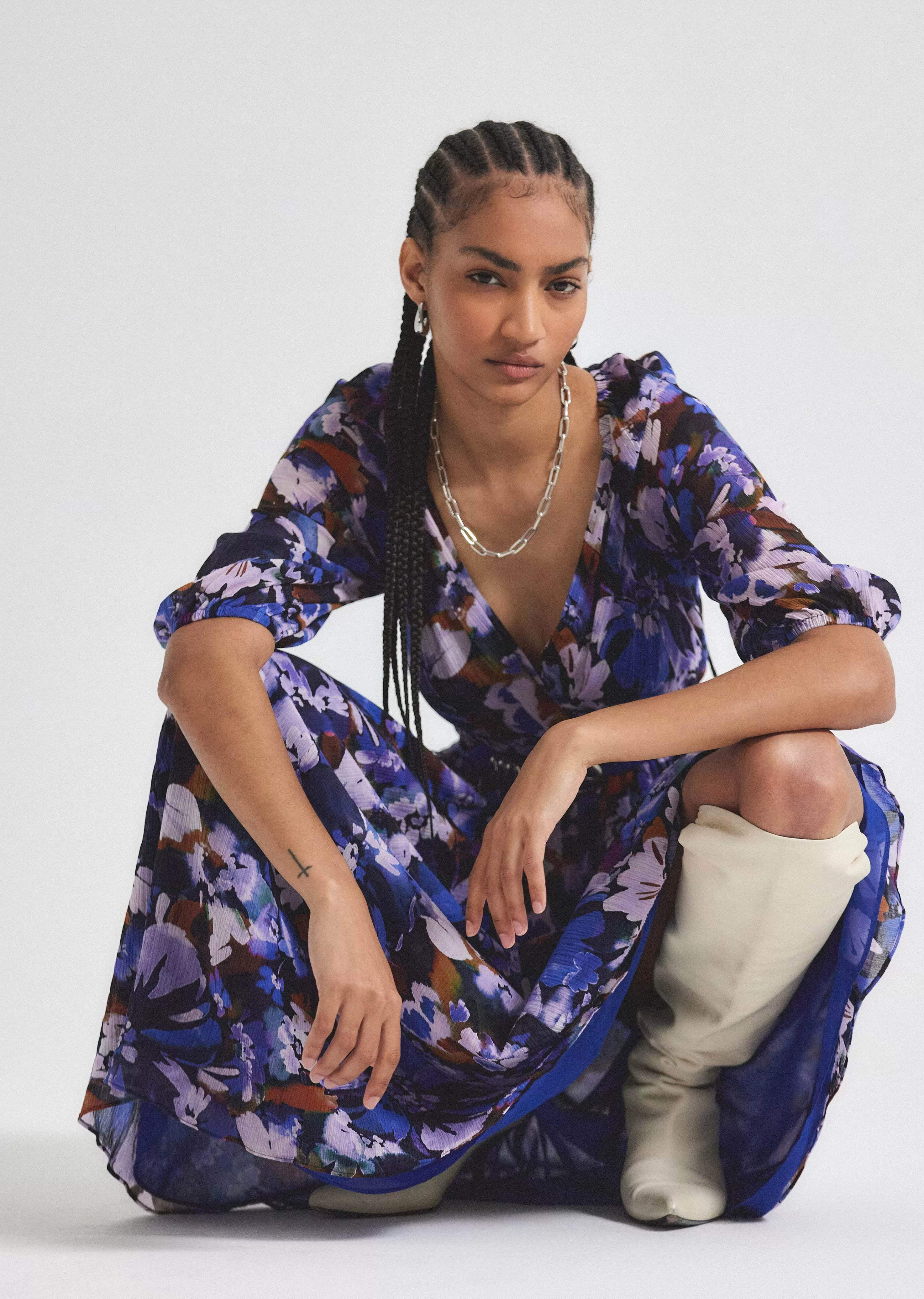 The Katie Maxi Dress is an elegant wrap style customized with a watercolor garden print. It features a fluid A- line sil…