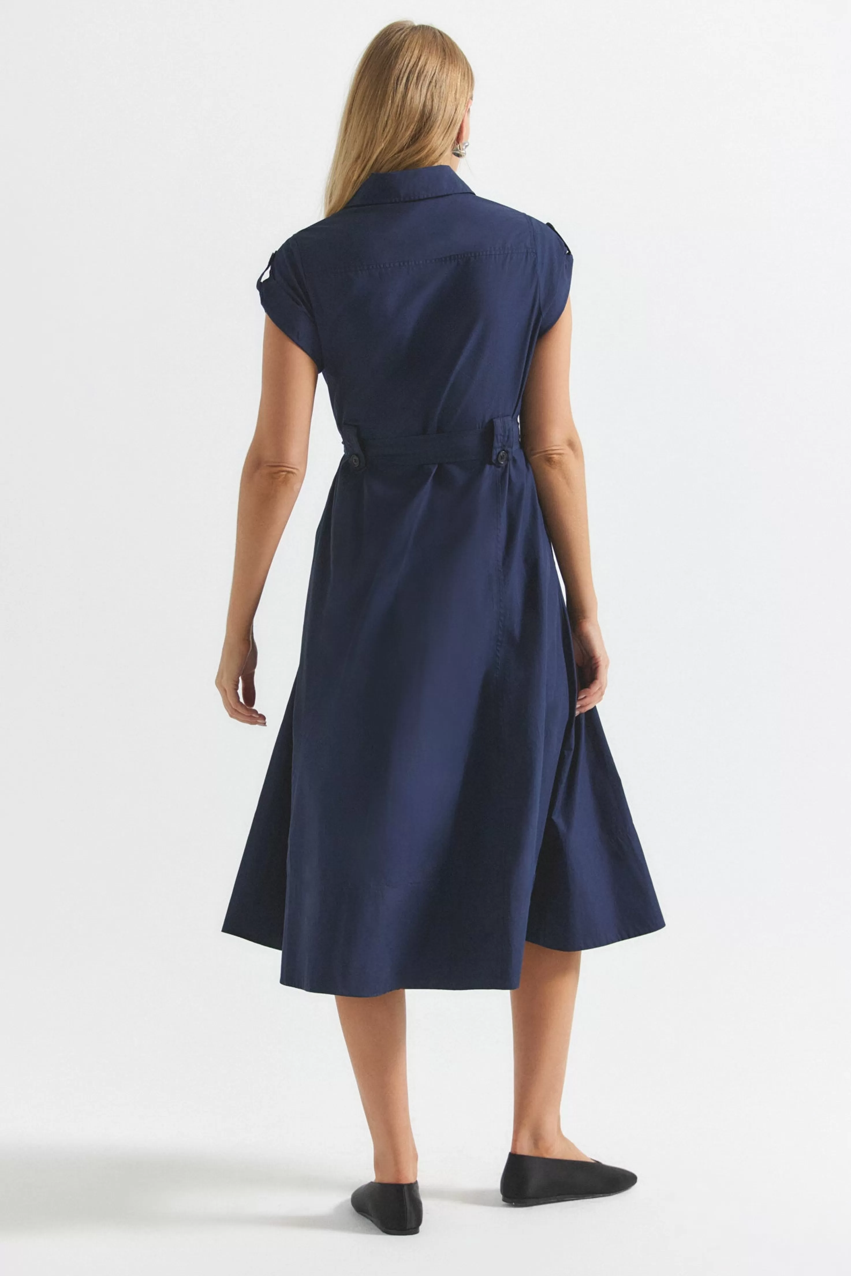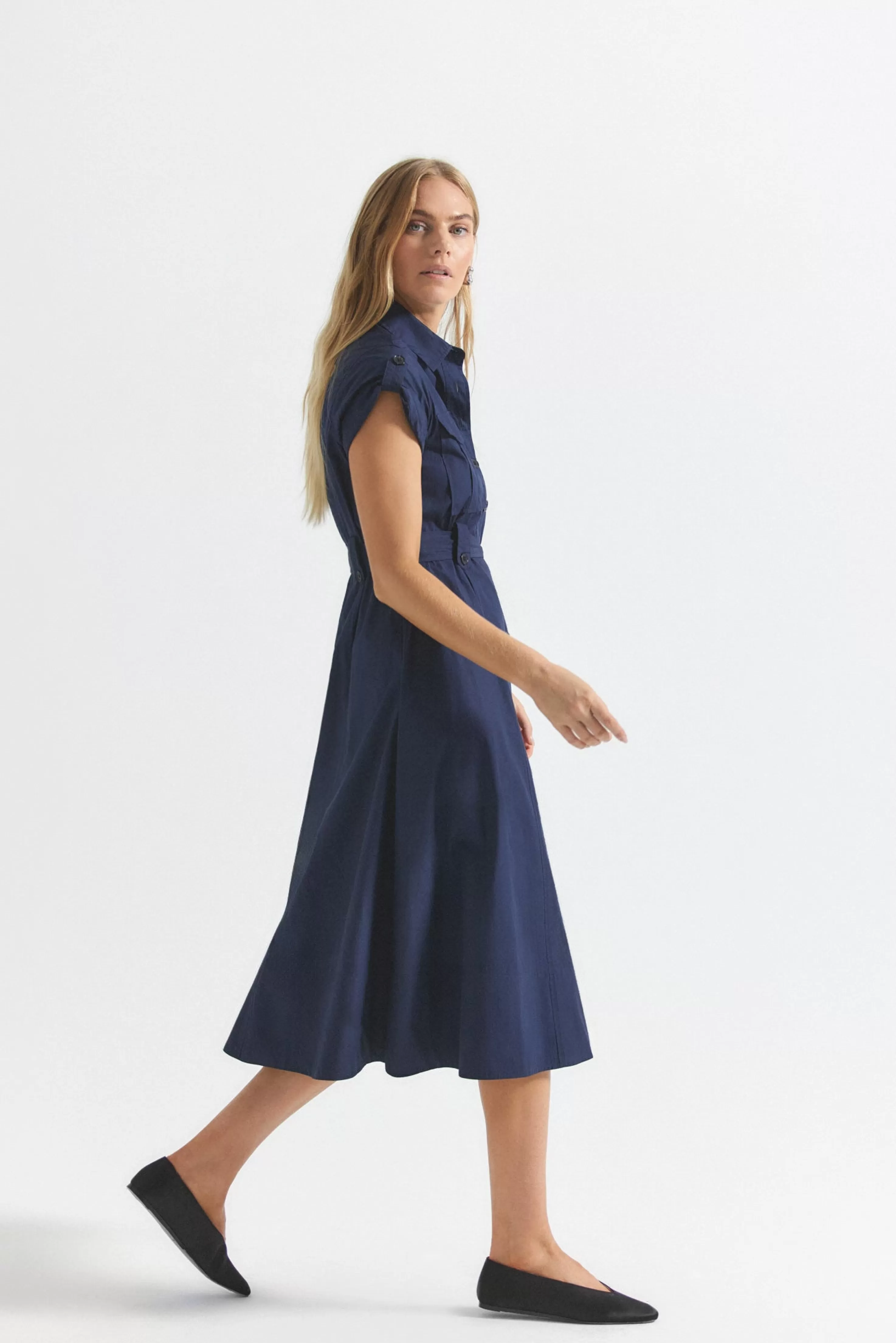 The Kayla Dress is a super soft utility style with an A-line silhouette, self belt and a cap detail at the sleeve for an effortless effect with a wide facing at the hem.