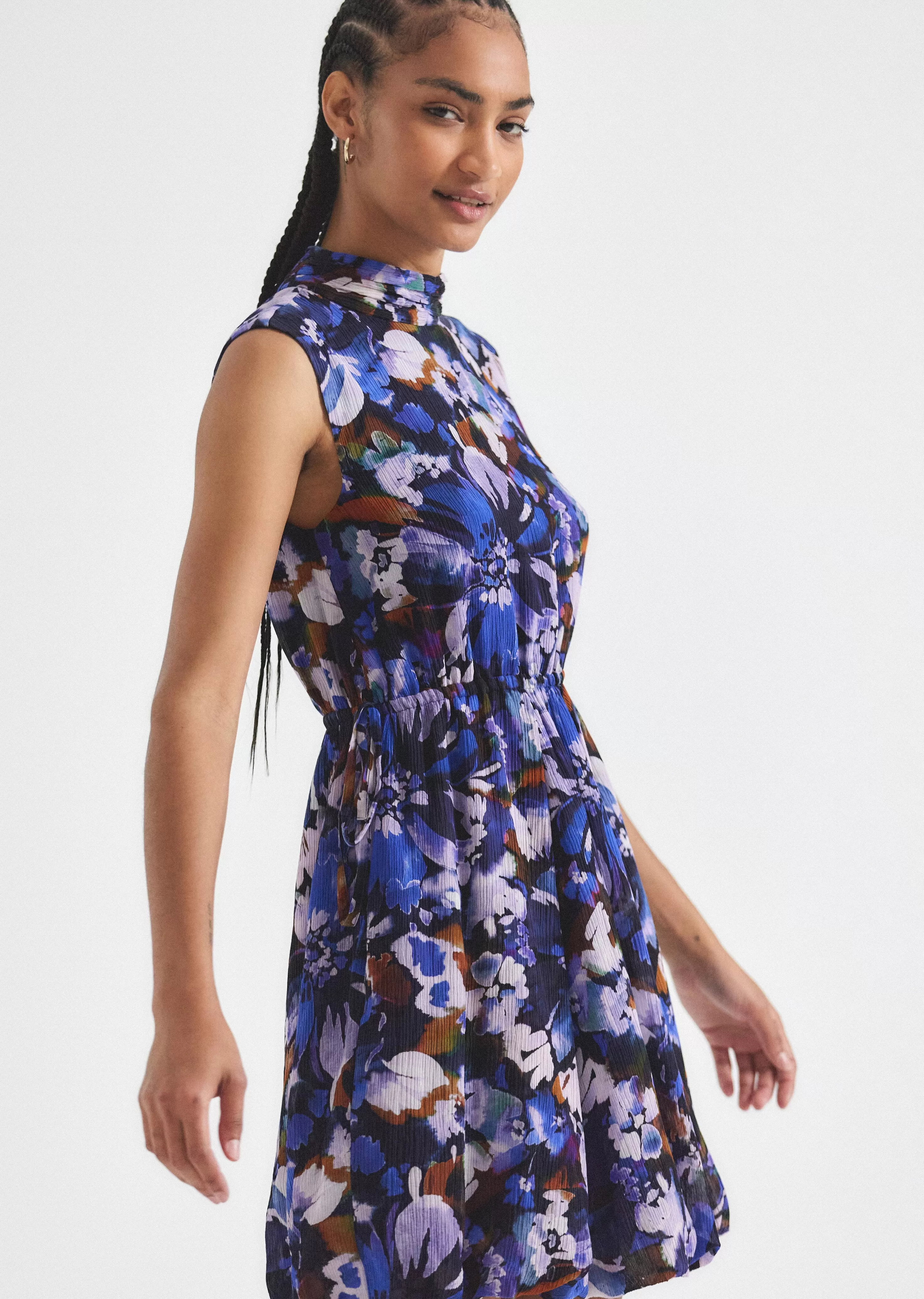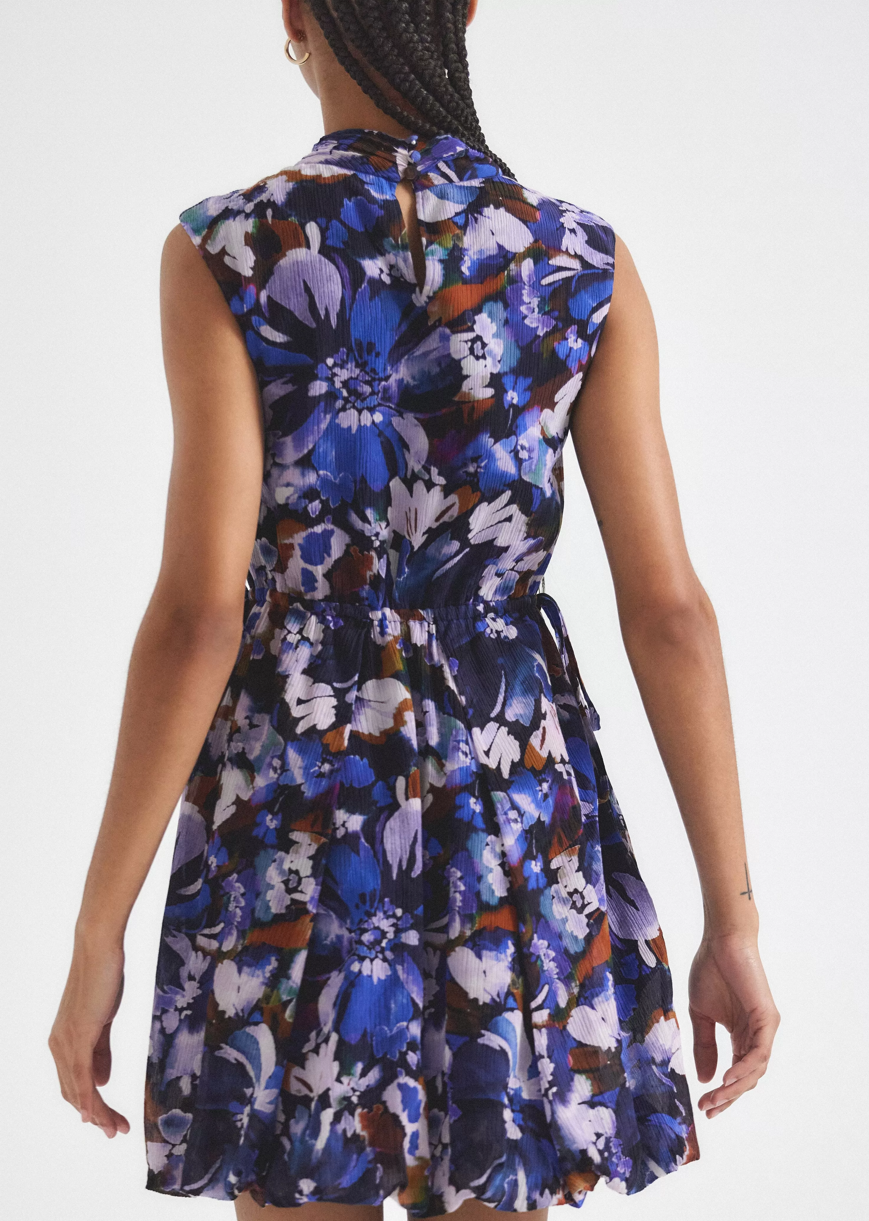 The Laura Bubble Hem Dress is a mock neck style customized with a watercolor garden print. It features back buttons and a fully elastic waist with ties on the side seams.