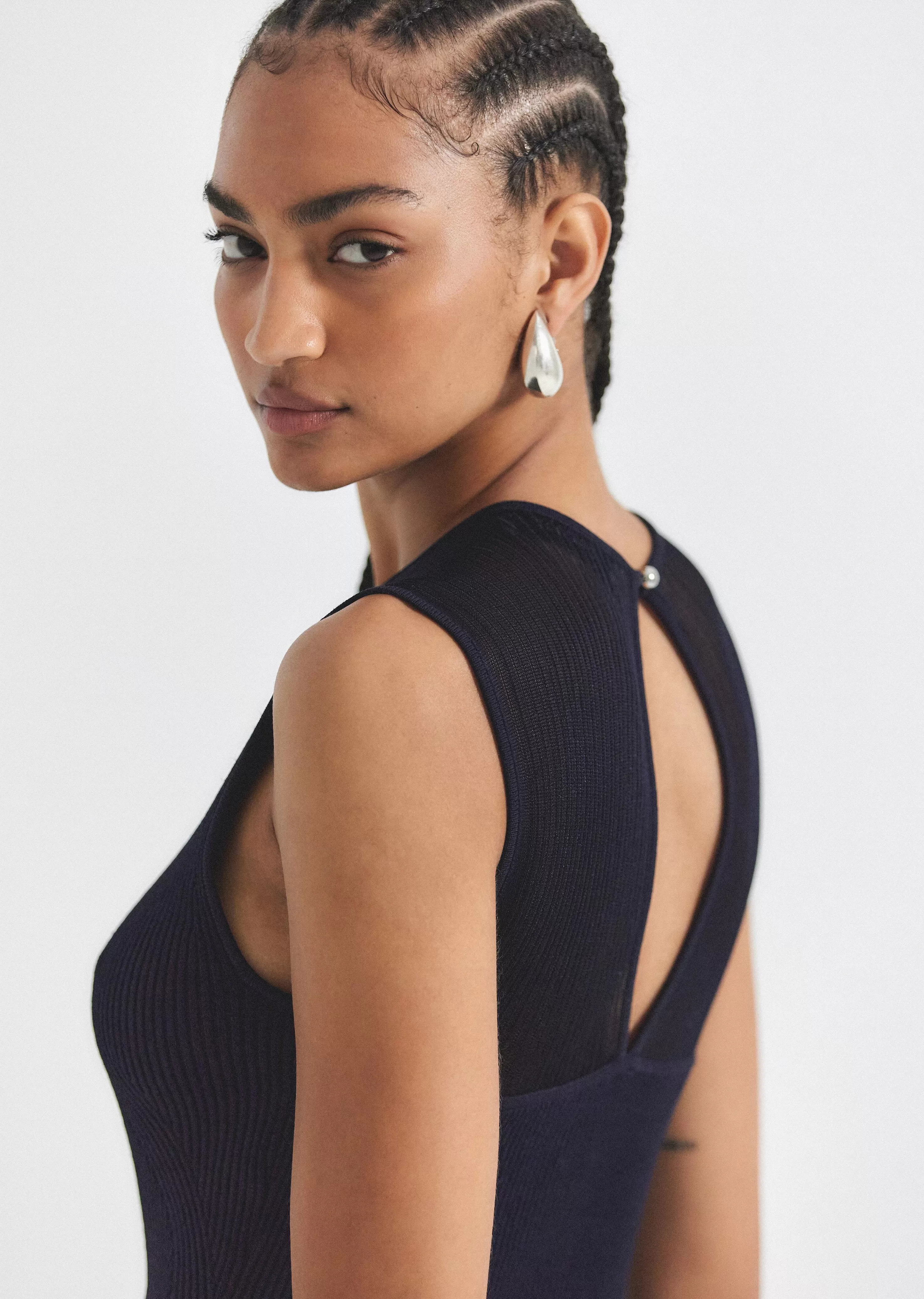 The Lecco Dress is an elegant column style that skims the body with a semi sheer look. It features a peek a boo back detail with a button closure at the neck.