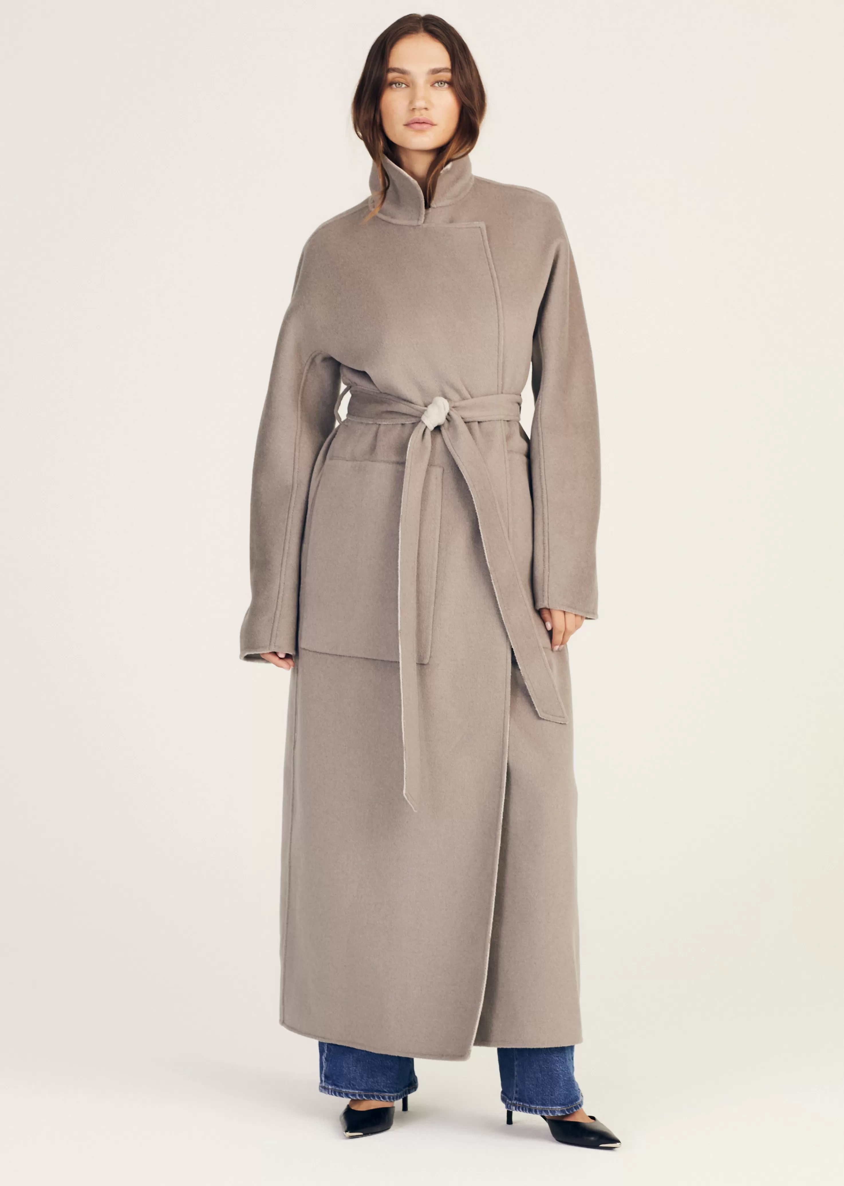 The Leone Reversible Double Face Wool Coat is a plush style crafted from a double faced wool blend. It features utility pockets, a self tied waist closure, and relaxed fit.