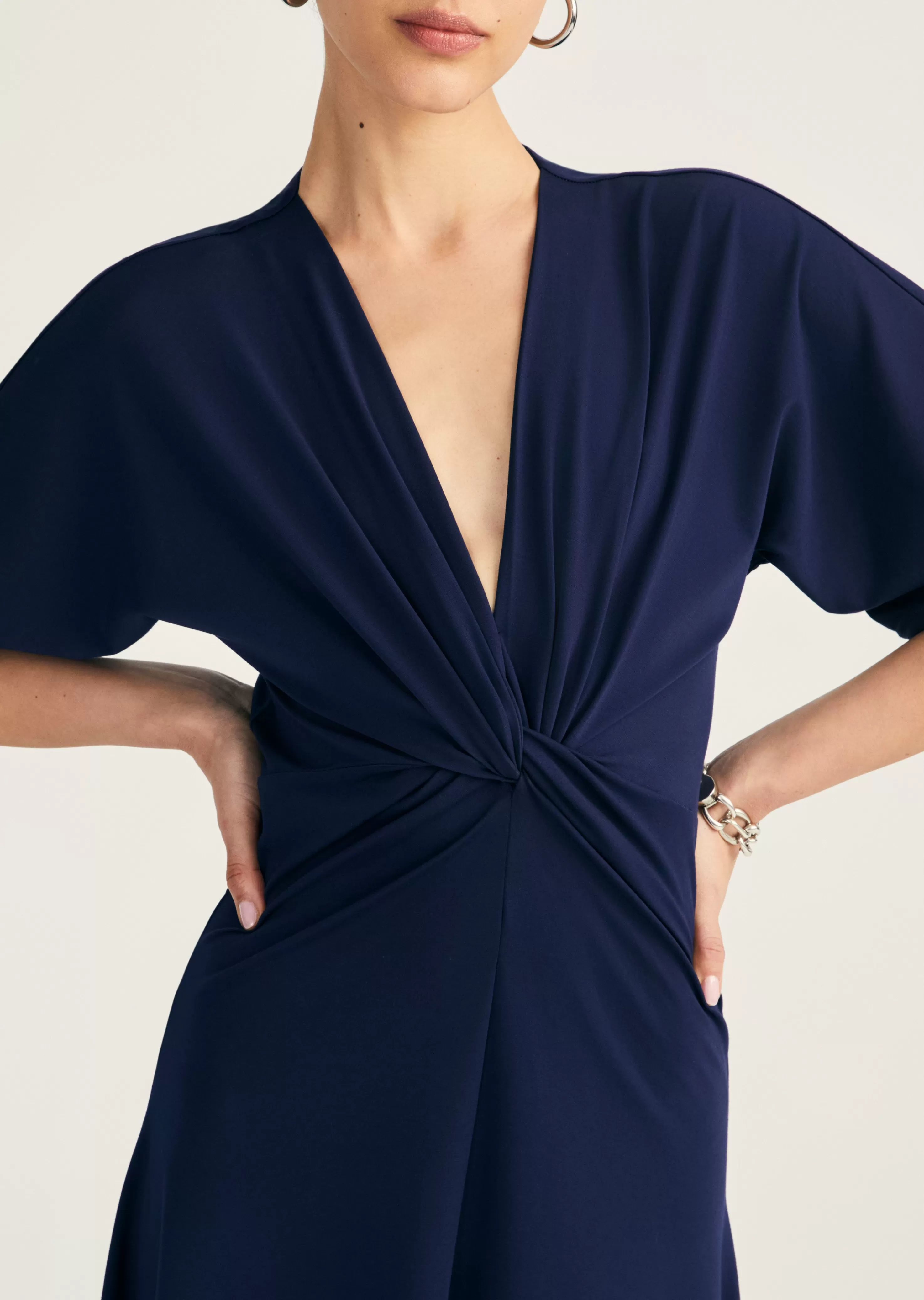 The Lorraine Twist Front Midi Dress is a mid weight style with a fluidly draped structure. It features a deep V-neck wit…