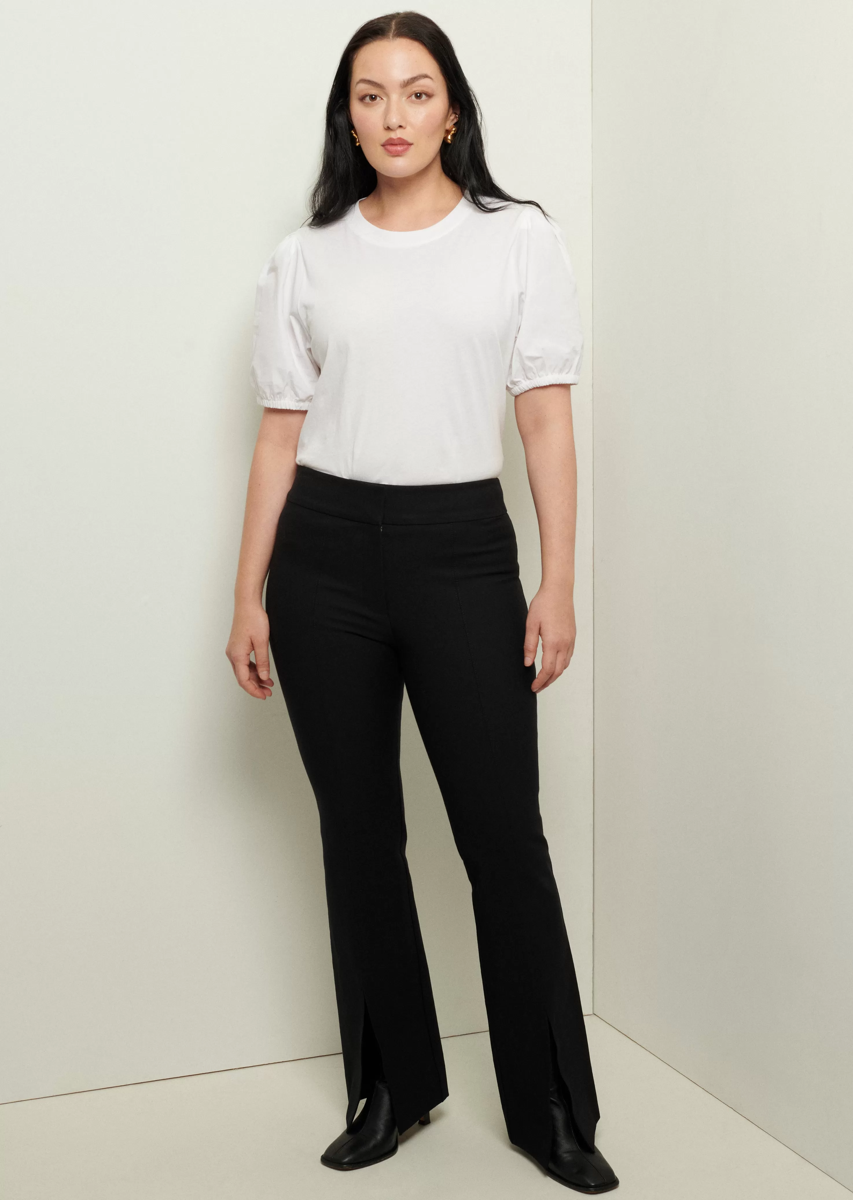 The Lucia Front Slit Trousers are crafted from our signature bi-stretch cotton Crosby twill. Cut with a high waisted silhouette and a slim fit, the long flared trousers offer a sleek and elongating look, with flattering slits at the hem. The comfortable versatile wardrobe staple is finished with a smooth waist and invisible side zip closure.This style is made in our best-selling Crosby Twill stretch cotton. The comfortable 2-way stretch cotton twill is wrinkle-resistant and lends itself to good stretch and recovery.