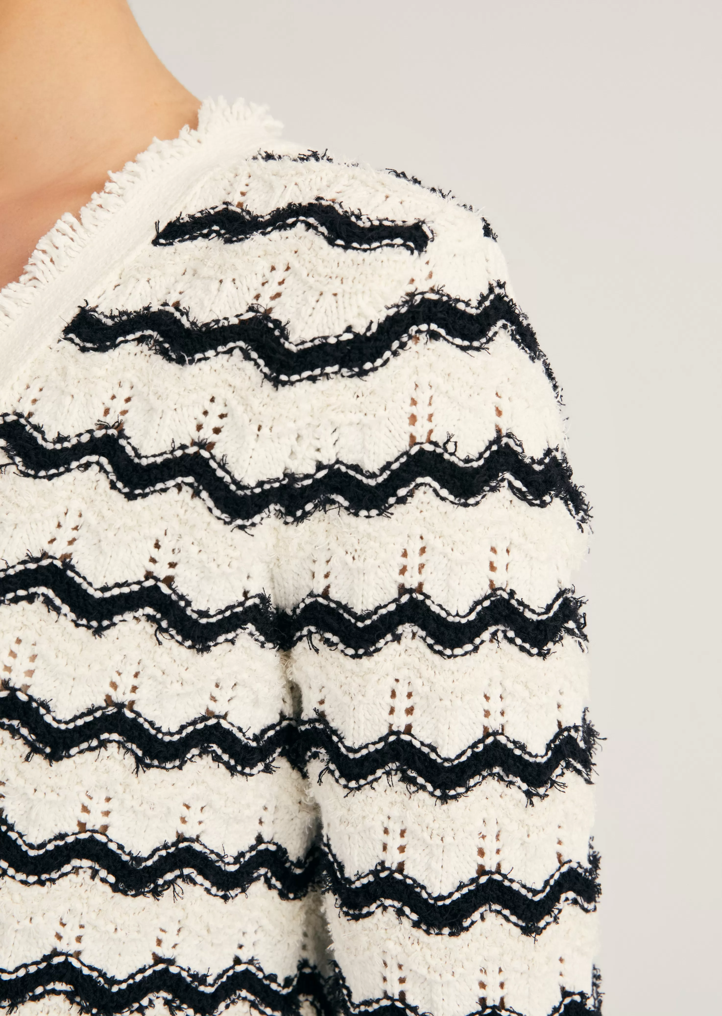 The Noé Scalloped Cardigan is a fringe texture style crafted from Italian eyelash yarns. It features scalloped pointell…