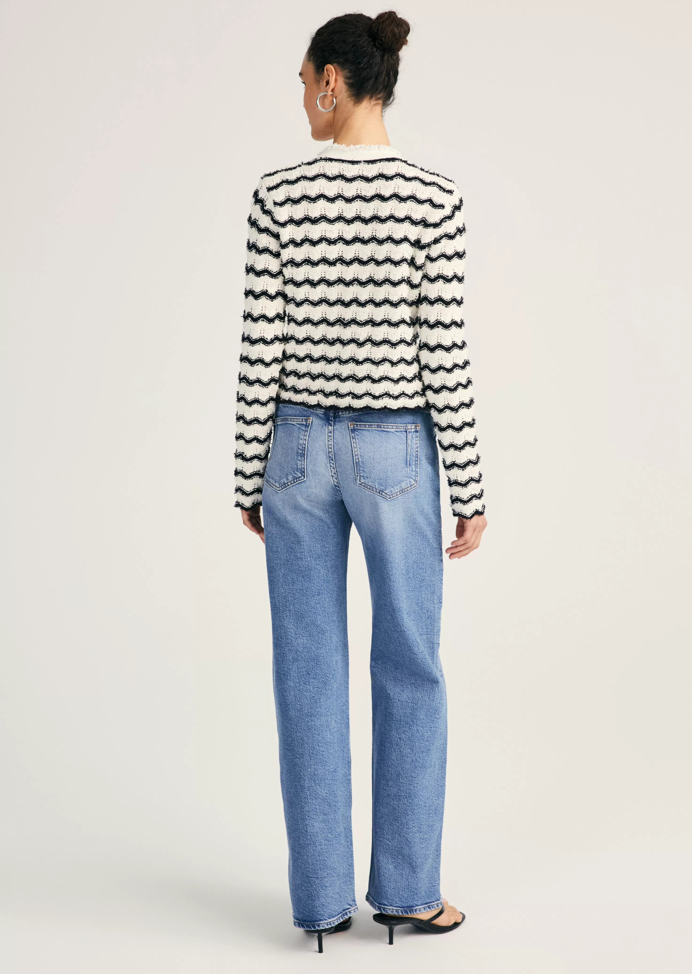 The Noé Scalloped Cardigan is a fringe texture style crafted from Italian eyelash yarns. It features scalloped pointelle stitching on the hem and cuffs with silver ball buttons.