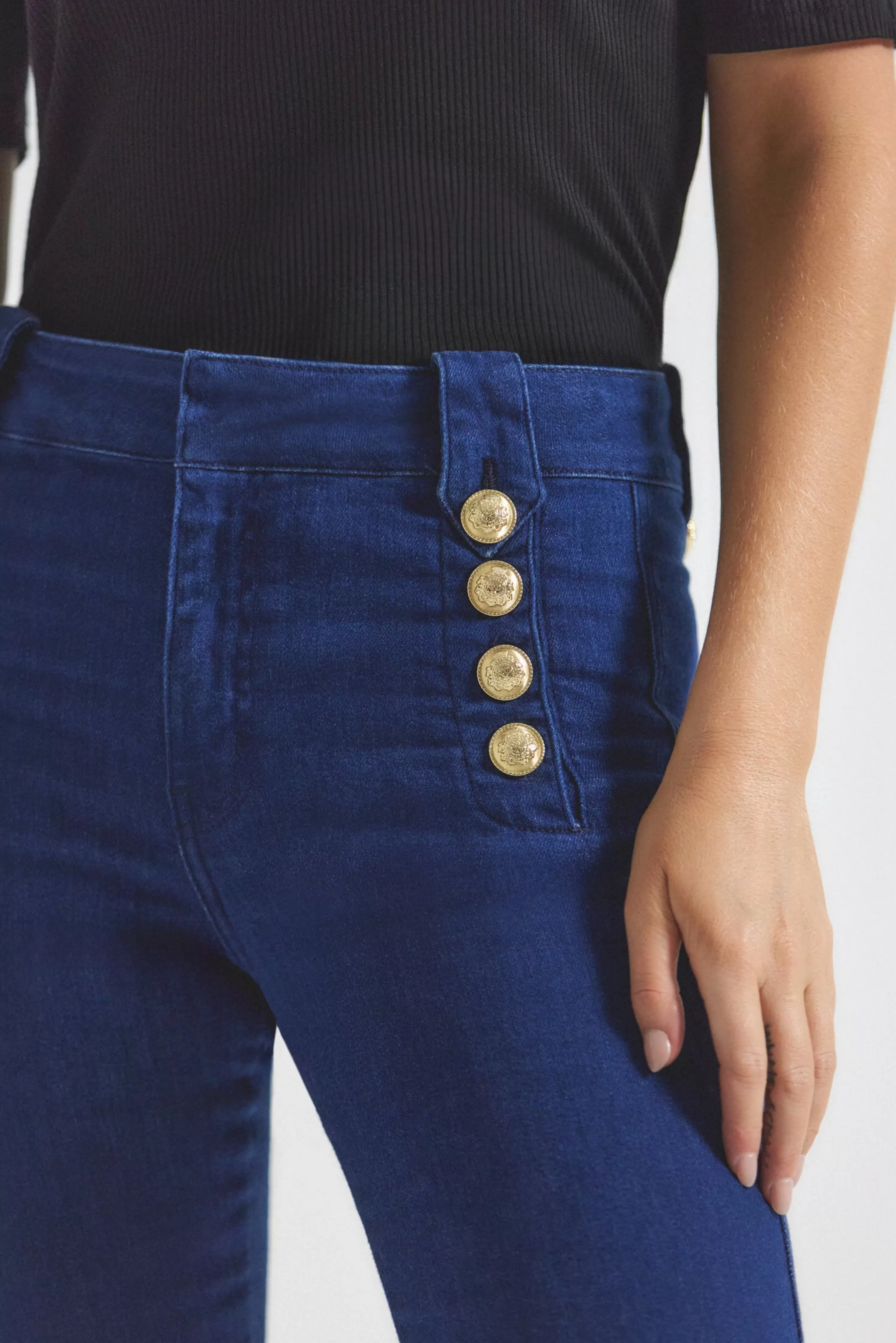 Our iconic cropped trouser with gold sailor button details along the hips is updated this season in a premium comfort stretch Italian denim with a stone-wash finish. Zip fly with button closure, flat front, tonal buttoned belt loops and stitching.