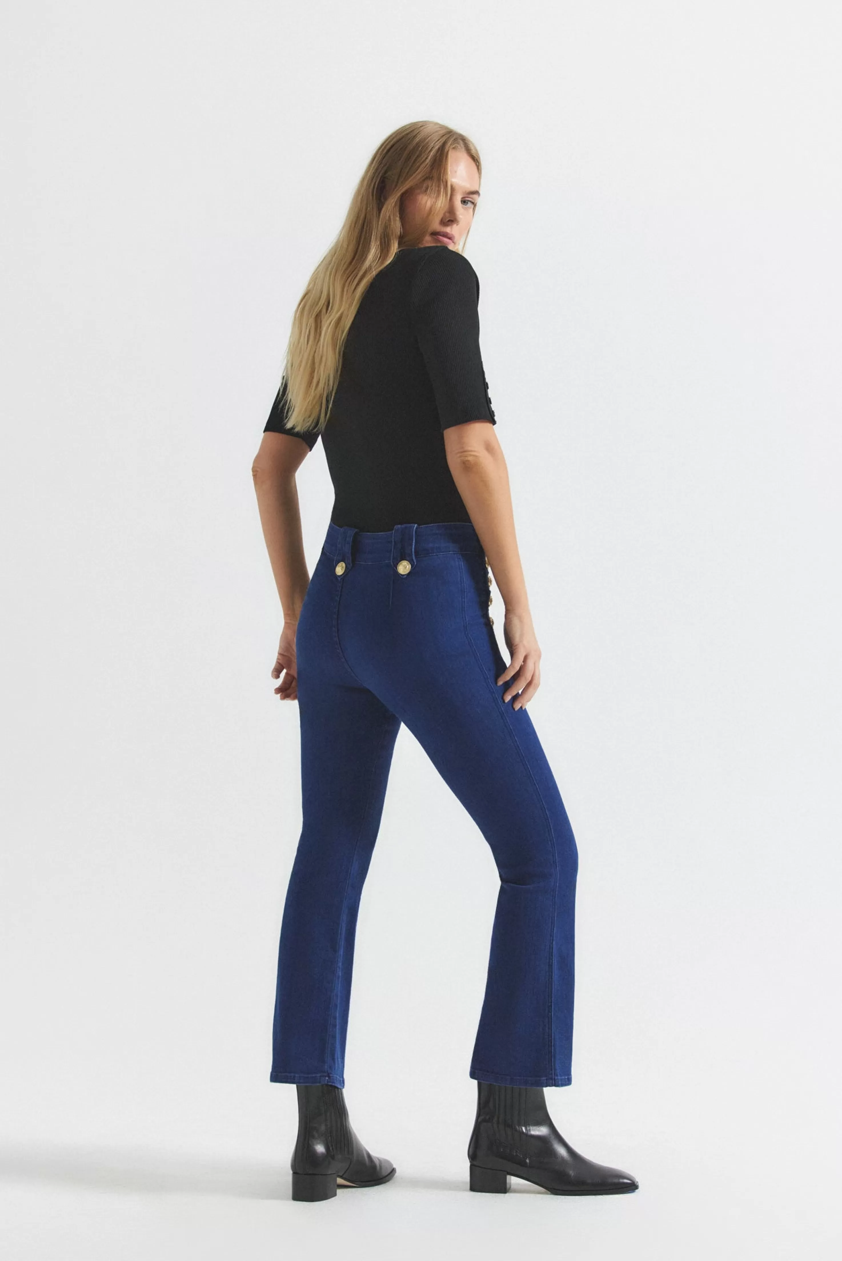 Our iconic cropped trouser with gold sailor button details along the hips is updated this season in a premium comfort st…