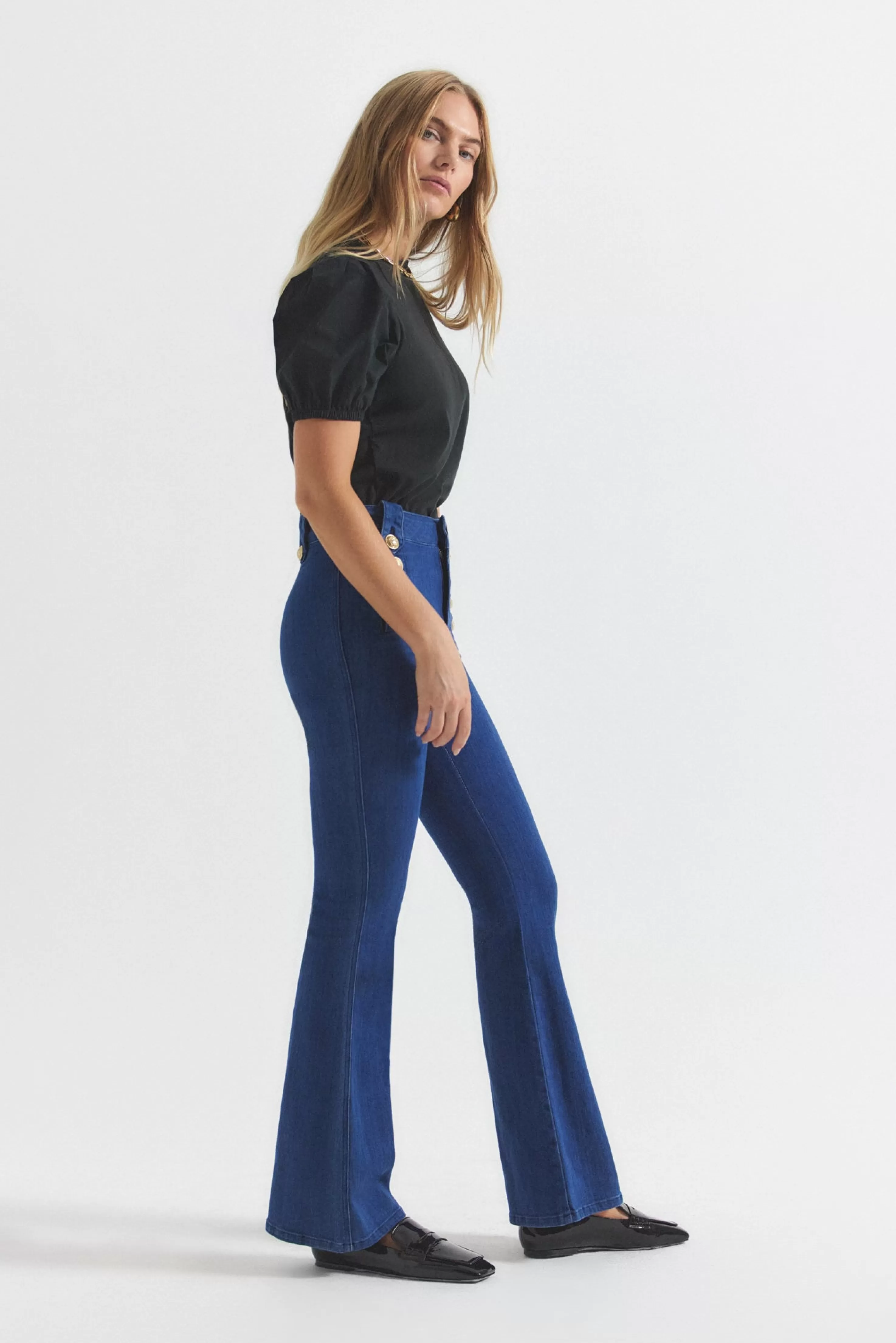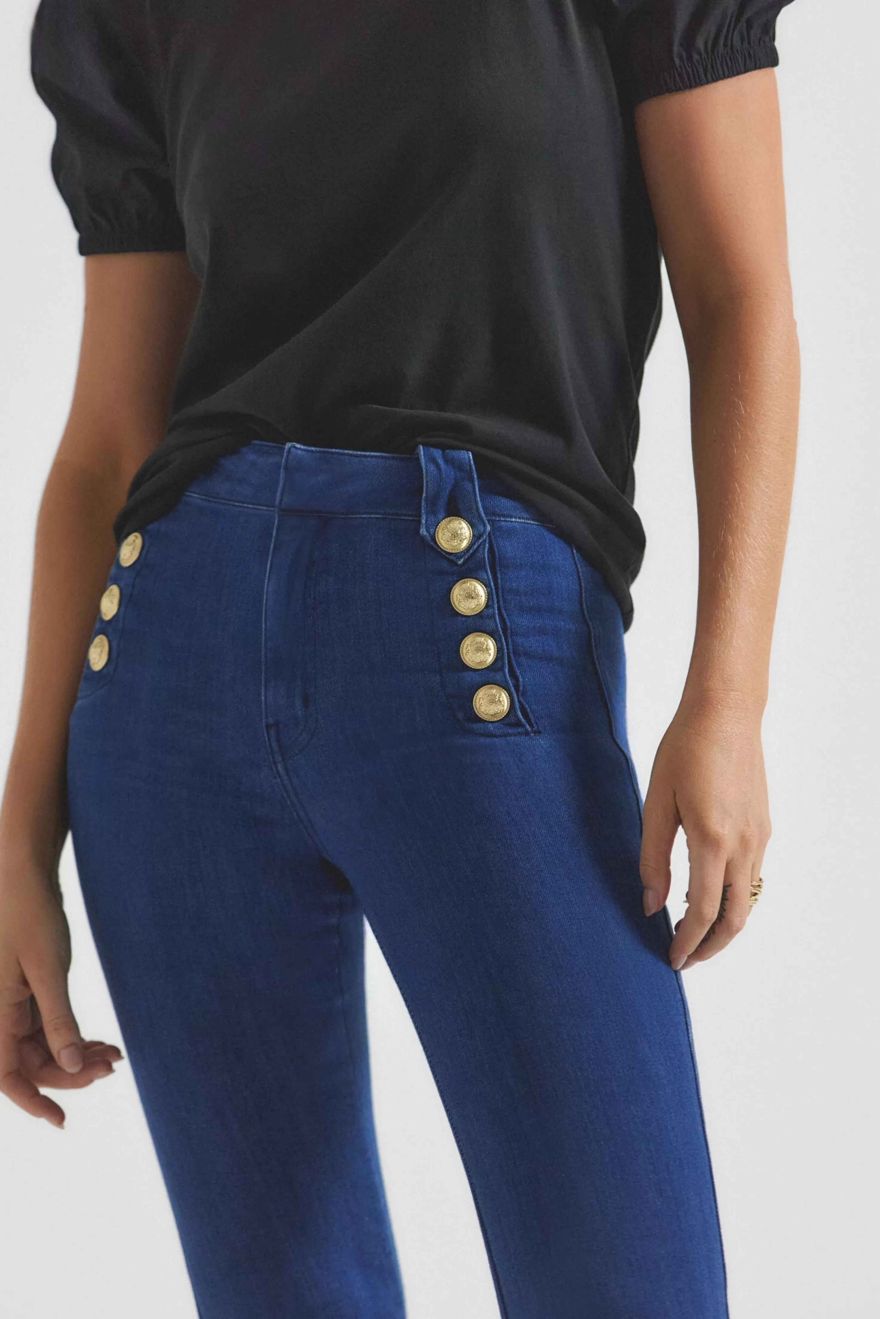 Our cult-favorite flared trouser with gold-tone sailor button details along the hips is updated this season in a premium comfort stretch Italian denim with a stone-wash finish. Zip fly with button closure, flat front, tonal belt loops and stitching.