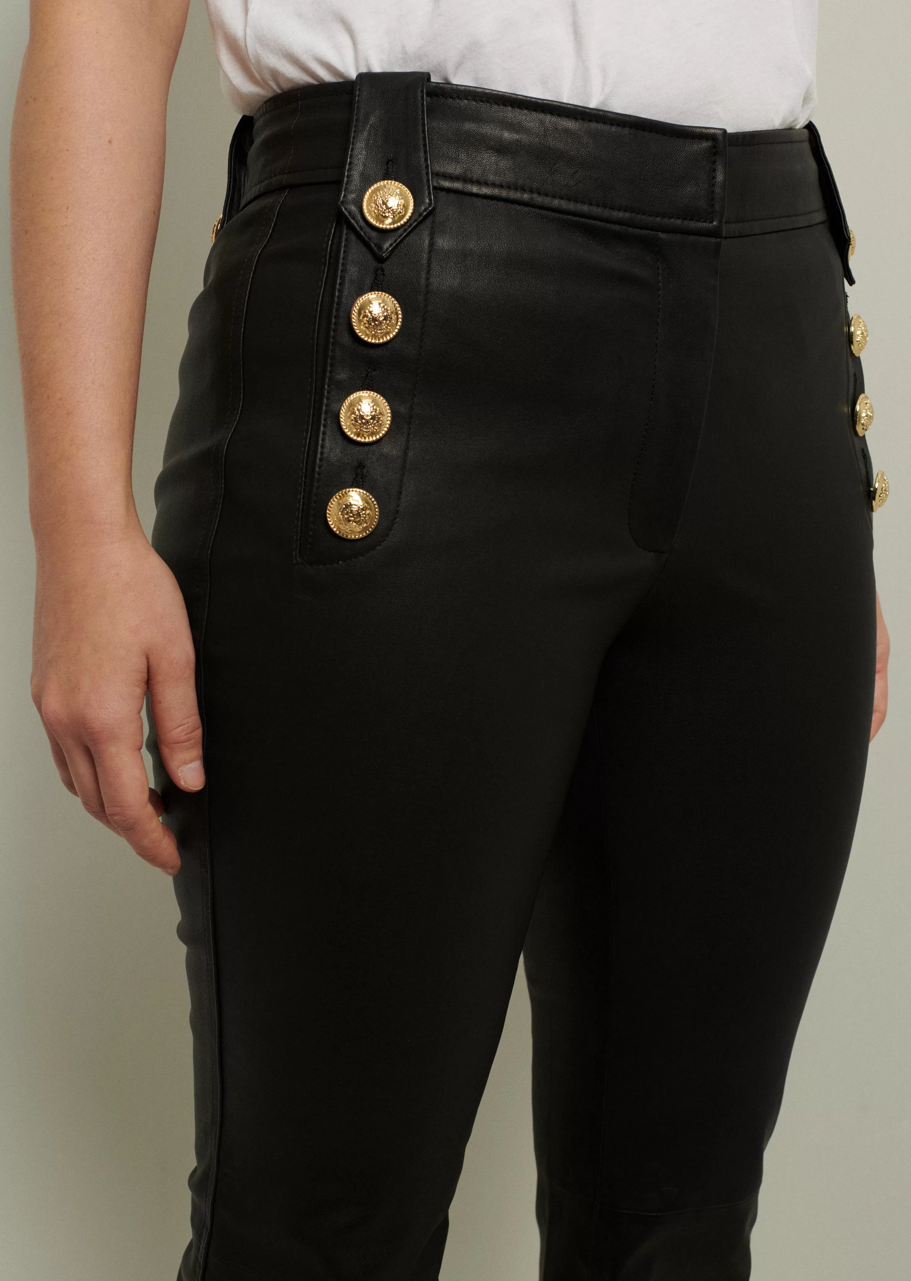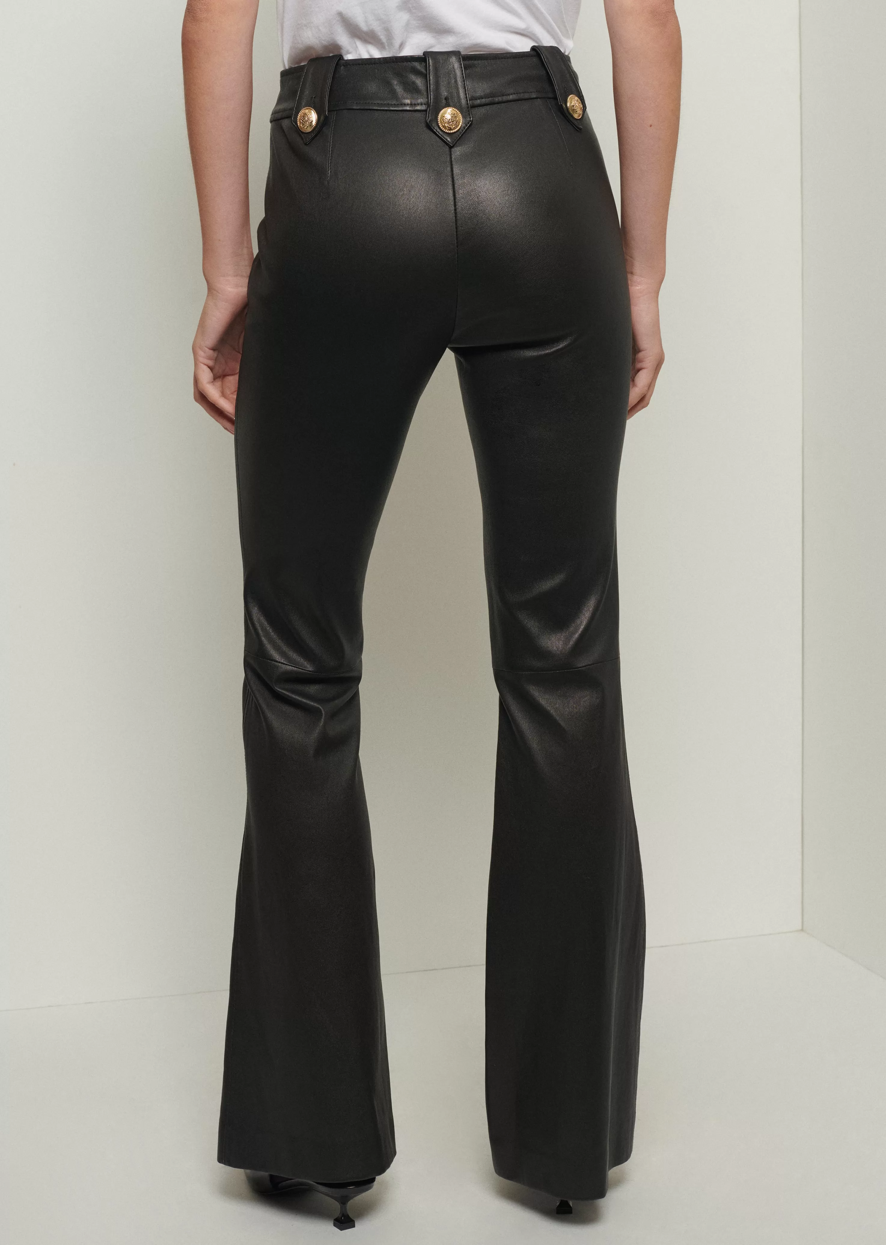 Our cult-favorite flared trouser with gold-tone sailor button details along the hips is updated this season in a luxe napa leather. Zip fly with button closure, flat front, tonal belt loops and stitching. Pair back to the leather Franklin jacket to complete the look.