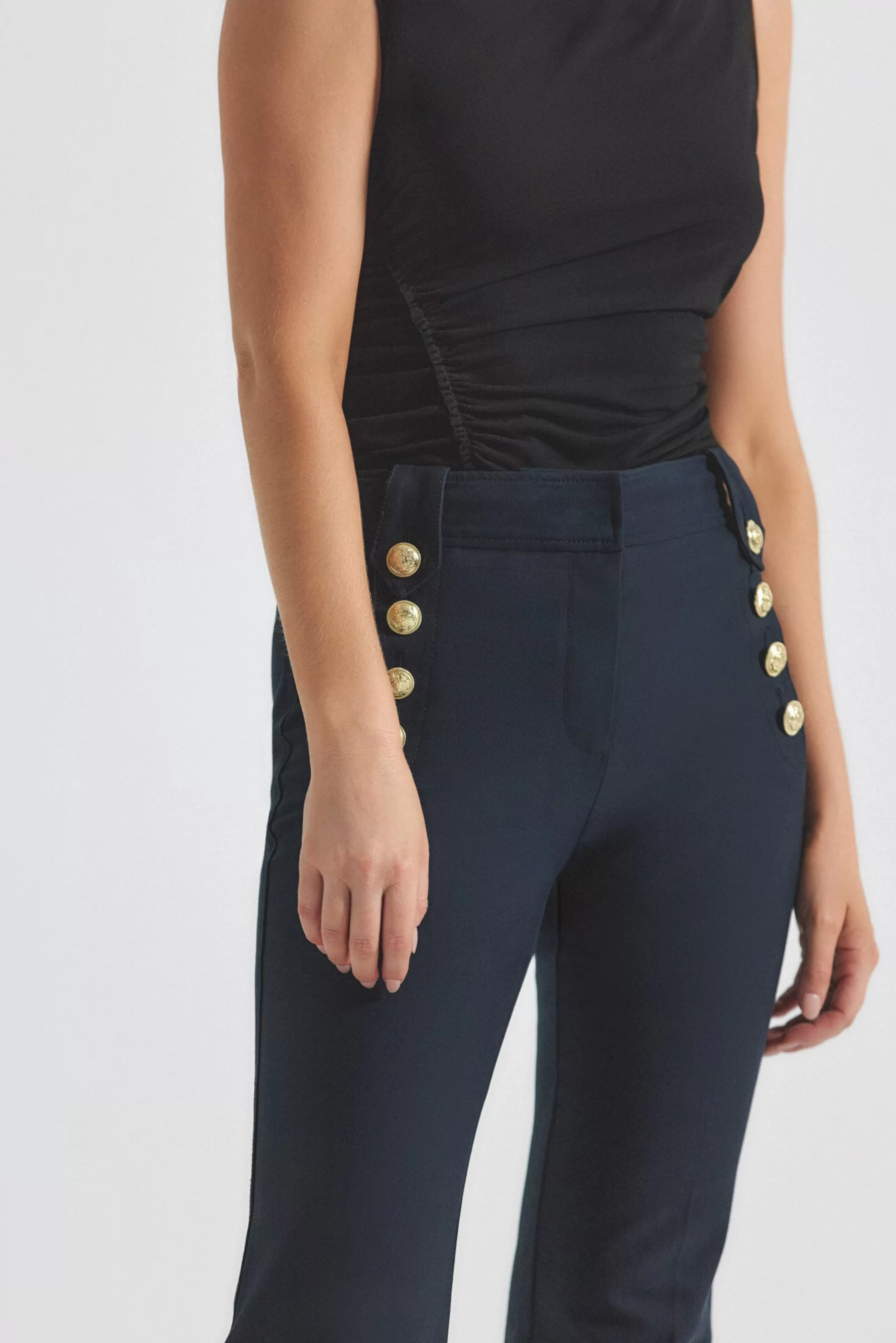 Our cult-favorite flared twill trouser with gold-tone sailor button details along the hips. Zip fly with button closure,…