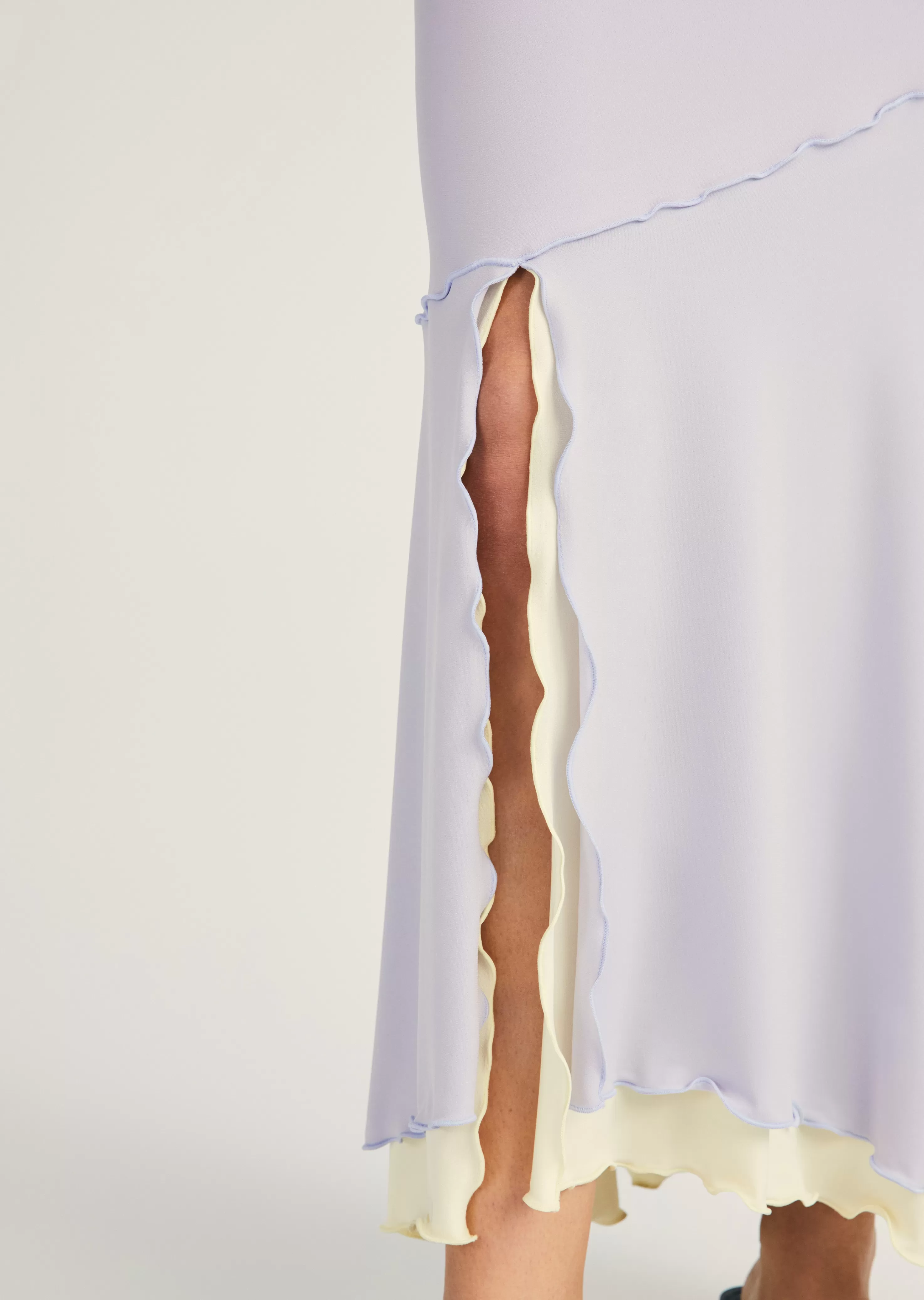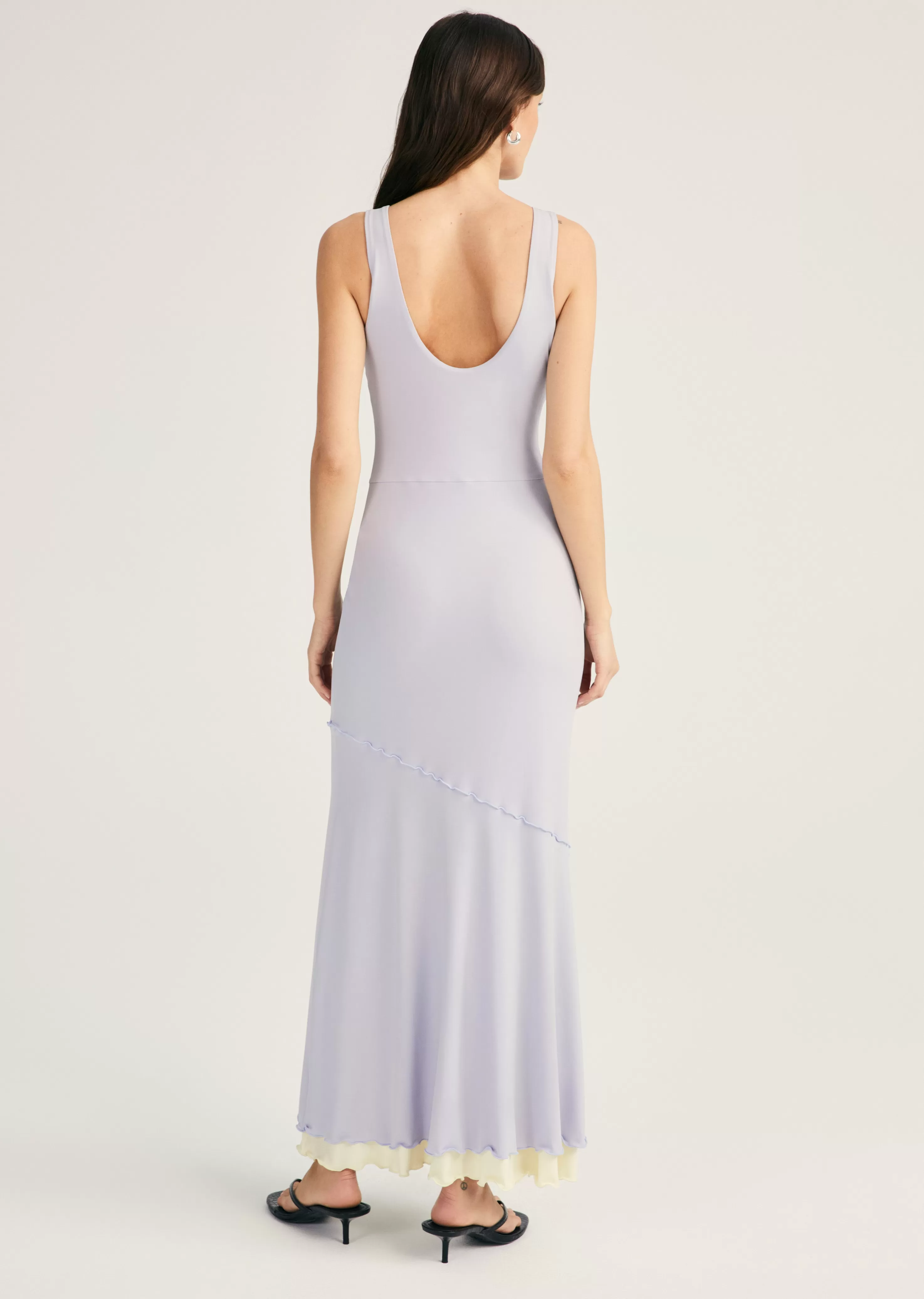 The Stephanie Slit Sleeveless Dress is a form fitting style with a relaxed drape crafted from ultra soft crepe jersey. It features a double layers with contrast tones and an asymmetrical lettuce edged hem.