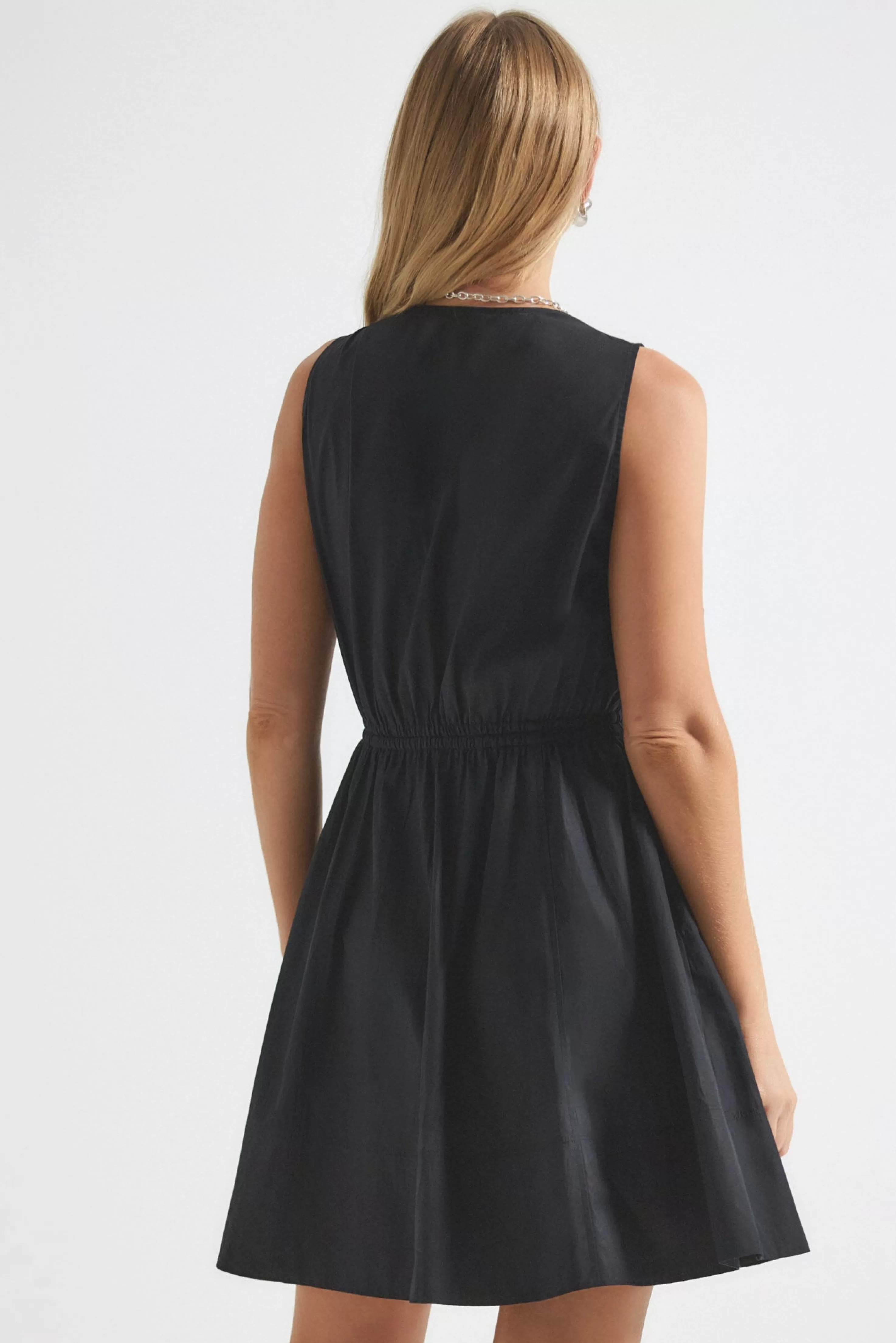 The Tia Dress is a utility style with a wrap neckline, elasticated waistband, and patch pockets. It features an A-line silhouette and patch pockets.